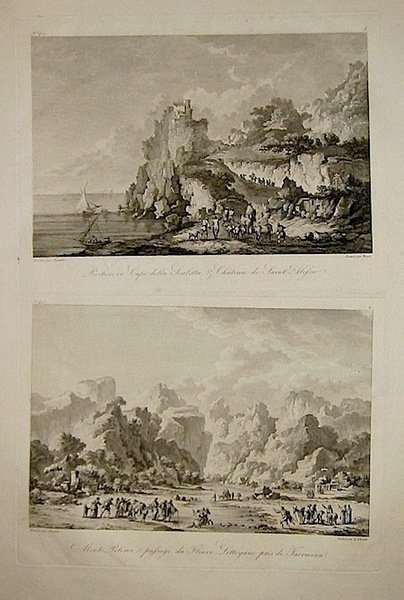 Coppia di acquaforti originale (cm. 25x19 ciascuna) su un foglio, tratte dal ‘Voyage pittoresque ou description des Royaumes de Naples et de Sicile’ dell’abate di Saint-Non. Ottimo esemplare.