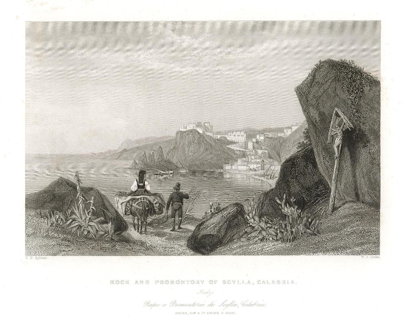 Stampa antica ed originale. Autore: Leitch W. L. dis. Luogo: Scilla - Reggio Calabria. Anno: 1851. Tecnica: incisione in acciaio. Dimensioni: 126x190. Opera inserita in alcune edizioni tra cui " Les Iles e les Bords de la Mediterranée comprenant la Sicile ." di M. Clément Pellé edita a Londra e Parigi da Fisher, Son & C. nel 1841 - "Il Mediterraneo illustrato le sue isole e le sue spiagge", edita a Firenze nel 1851 presso Spirito Batelli
