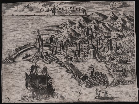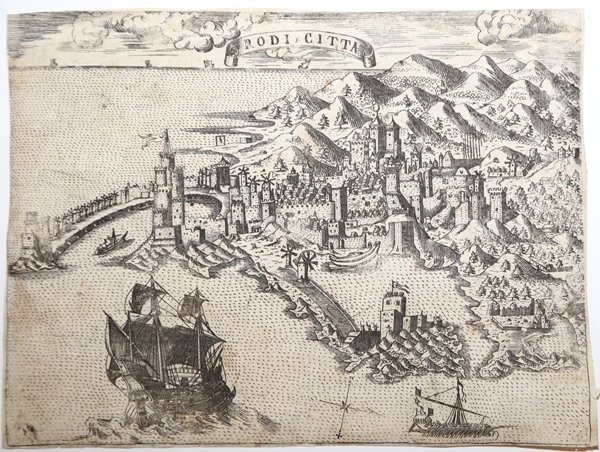 Questa veduta, poco nota dalla letteratura, è pubblicata dalla tipografia di Donato Bertelli; alcuni esemplari della veduta si trovano nel Le vere imagini et descritioni delle piu nobili città del mondo, edito a Venezia da Donato nel 1569, in assoluta concorrenza con le raccolte di Forlani (1567) e del consanguineo Ferrando Bertelli (1568). Altri esemplari sono occasionalmente inseriti nel "Civitatum Aliquot insigniorum et locorum… "del Bertelli, libro sulle principali città del mondo che segue di un solo anno l’analoga opera del Forlani (1567) e precede di uno la più comune raccolta del Ballino (1569). L'opera fu ristampata ed ampliata da Donato Bertelli nel 1574. Incisione in rame, priva dei margini, piccoli restauri, tracce di colla al verso, nel compesso in buono stato di conservazione. Molta rara. Questa veduta, poco nota dalla letteratura, è pubblicata dalla tipografia di Donato Bertelli; alcuni esemplari della veduta si trovano nel Le vere imagini et descritioni delle piu nobili città del mondo, edito a Venezia da Donato nel 1569, in assoluta concorrenza con le raccolte di Forlani (1567) e del consanguineo Ferrando Bertelli (1568). Altri esemplari sono occasionalmente inseriti nel "Civitatum Aliquot insigniorum et locorum… "del Bertelli, libro sulle principali città del mondo che segue di un solo anno l’analoga opera del Forlani (1567) e precede di uno la più comune raccolta del Ballino (1569). L'opera fu ristampata ed ampliata da Donato Bertelli nel 1574. Incisione in rame, priva dei margini, piccoli restauri, tracce di colla al verso, nel compesso in buono stato di conservazione. Molta rara. Cfr. Tooley (1983): n. 463a; Zacharakis (2016): n. 349a.
