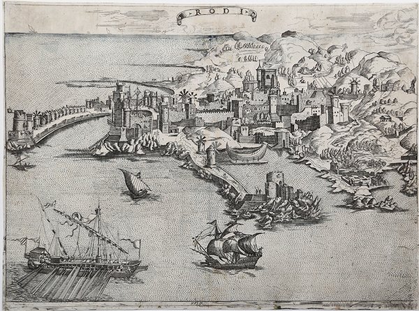 Anonima veduta prospettica di Rodi, priva di data ed indicazioni editoriali. In alto al centro, in un nastro, il titolo: RODI. Opera priva di orientazione e scala grafica. Acquaforte e bulino, magnifica prova, impressa su carta vergata coeva, rifilata al rame, tracce di antica coloritura, in perfetto sato di conservazione.L’opera sembra essere una riduzione del modello introdotto da Bernhard von Breydenbach nel Peregrinatio in Terram Sanctam (Mainz 1486). Come giustamente nota la Borroni, questa incisione appare particolarmente più accurata, oltre che di formato maggiore, rispetto alle analoghe vedute della città pubblicate da Bertelli, Camocio e Pinargenti. L’incisione è di estrema rarità; oltre all’esemplare descritto da Borroni (Nazionale di Firenze) e quello dell’atlante di Alessandro d’Este (Estense di Modena), ne abbiamo censito solamente uno alla Bibliothèque Nationale ed un altro in una collezione privata romana. Non sono note ristampe.Magnifico esemplare di questa rarissima veduta prospettica di Rodi. Anonymous perspective view of Rhodes, with no date and editorial indications. A Lafreri school engraving, known in 3 examples.At the top center, the title: RODI. Without orientation and graphic scale.Etching and engraving, magnificent proof, printed on contemporary laid paper, trimmed to copperplate, traces of ancient coloring, very good condition.The work appears to be a reduction of the model introduced by Bernhard von Breydenbach in the Peregrinatio in Terram Sanctam (Mainz 1486). As Borroni rightly notes, this work appears to be particularly more accurate, as well as of a larger format, than the analogous views of the city published by Bertelli, Camocio and Pinargenti.The view is extremely rare; in addition to the example described by Borroni (Biblioteca Nazionale of Florence) and that of the atlas of Alessandro d'Este (Biblioteca Estense of Modena), we have only recorded one at the Bibliothèque Nationale de France. There are no known reprints.Magnificent example of this very rare perspective view of Rhodes. Cfr. Borroni Salvadori (1980): n. 243; Tavernari (2014): n. 114.