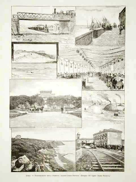 Stampa antica ed originale raffigurante in nove vignette in unico foglio, la cerimonia di inaugurazione e alcune località lungo la linea ferroviaria. Testo al verso non inerente
