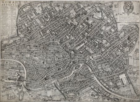 Pianta archeologica a proiezione verticale, con rappresentazione in alzato degli edifici antichi. Pubblicata da Goffredo de Scacchi (nato a Utrecht come Goert van Schayck), la tavola reca lo stemma del Sacro Romano Imprero di Federico II d'Ausburgo, e la dedica al suo console Johann Vincentio. Esemplare nel primo stato di due, avanti l'imprint di Carlo Losi.In alto: a sinistra in un riquadro il titolo ROMA ANTIQUA e una legenda numerica disposta su due colonne di cinquantadue rimandi a luoghi e monumenti notabili, a destra in un cartiglio con in alto lo stemma nobiliare la dedica IOANNI VINCENTIO SAC. ROM. IMP. ATQ[UE] COMITI Domino Penedarum, Drenae, Spinedi, et Restauri Invict.mi FERDINANDI II Romanor Imperatoris & Co[n]siliario et à Cubiculis. Ordinis Militiae Christ.nae Equiti, et Priori Comitat Tirolis, et Heluetiae, Eiusde[m] q[ue] Ord.is ad Sum.mi Pontif. Caeterosq[ue] Italiae Principes Legato. Gotfridus de Scachijs DDD.Acquaforte e bulino, impressa su carta vergata coeva, con margini, minimi restauri e pieghe di carta visibili al verso, per il resto in ottimo stato di conservazione. Rara. BibliografiaArrigoni-Bertarelli (1930): p. 8, n. 76; Christie’s (1998): n. 1033; Ganado (1994): p. 171, n. 117 e p. 213, n. 52; Frutaz (1962): p. 73, n. XXVIII, Tav. 62; Hülsen (1915): VIIId, pp. 56, nn. 42-43; Scaccia Scarafoni (1939): p. 31, n. 28. Engraved bird's-eye view of ancient Rome on a Royal sheet. Example of the first state of two, before the address of Carlo Losi.Title and key to principal buildings set at upper left, dedication in scrolled cartouche suromounted by the arms of the Holy Roman Emperor, Ferdinand II (Habsburg), dedicated by his councillor, Johann Vincentio. Little is known about Geert van Schayk save that he was active as a publisher between 1620 and 1635. (See A.J. van der Aa Biographisch woordenboek der Nederlanden , XVII, p. 230). A fine impression, printed on contemporary laid paper, with margins, repaired areas and paper fold visible on verso, otherwise good condition. Rare.BibliografiaArrigoni-Bertarelli (1930): p. 8, n. 76; Christie’s (1998): n. 1033; Ganado (1994): p. 171, n. 117 e p. 213, n. 52; Frutaz (1962): p. 73, n. XXVIII, Tav. 62; Hülsen (1915): VIIId, pp. 56, nn. 42-43; Scaccia Scarafoni (1939): p. 31, n. 28. Cfr.