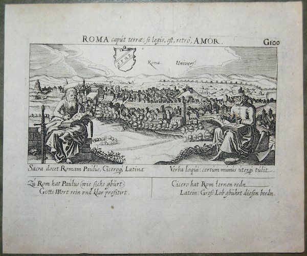 Veduta tratta dall'edizione del 1678 della celebre ' Sciagraphia Cosmica ' nota anche con il titolo ' Das ist Newes Emblematisches Buechlei, dainen in acht Centurijs die vornembste Stat, Vestung, Schlosser der ganzen Welt. ' stampata a Norinberga. La ' Sciagraphia Cosmica, venne ampliata sotto la supervisione di Kieser dopo la morte di Meisner nel 1625, arrivando quindi ad una composizione di 800 magnifiche incisioni. ' Ogni opera è caratterizzata da un motto sopra l'immagine, e da versi emblematici (in latino o tedesco). L'opera è la combinazione di due generi allora popolari, il libro degli stemmi e il "Teatro delle città". ' Tra i maestri incisori e miniatori che contribuirono a questa serie ci sono Matthäus Merian, Sebastian Furck, Christian Stimmer e forse anche Meisner stesso, che concepì l'opera e contribuì a buona parte della prosa. ' Incisione in rame, con margini, in perfetto stato di conservazione. Panorama of the city, taken from the 1678 edition of the famous "Sciagraphia Cosmica" with the title "Das ist Newes Emblematisches Buechlei, dainen in acht Centurijs die vornembste Stat, Vestung, Schlosser der ganzen Welt.Nuremberg, 1678'. "Of little topographical interest, the view shows the Capitoline Hill emerging from the adjacent urban fabric, while the view to the left closes in on a scarcely recognizable St. Peter's. The author's name is only written on the title page. In addition to Meisner himself, the engravers involved included Merian, Furck and Stimmer" (cf. Marigliani p. 194). The Sciagraphia Cosmica was expanded under the supervision of Kieser after Meisner's death in 1625, resulting in a composition of 800 magnificent engravings. ' Each engraving is characterised by a motto above the image and emblematic verses (in Latin or German). The work is a combination of two popular genres, the Book of Coats of Arms and the Book of City Plants. ' Among the master engravers and illuminators who contributed to this series are Matthäus Merian, Sebastian Furck, Christian Stimmer and possibly Meisner himself, who conceived the work and contributed much of the prose. ' Copper engraving, with margins, in perfect condition. Cfr. Cremonini pagg. 57/58, 45a; C. Marigliani, "Le Piante di Roma delle collezioni private", tav. 97.