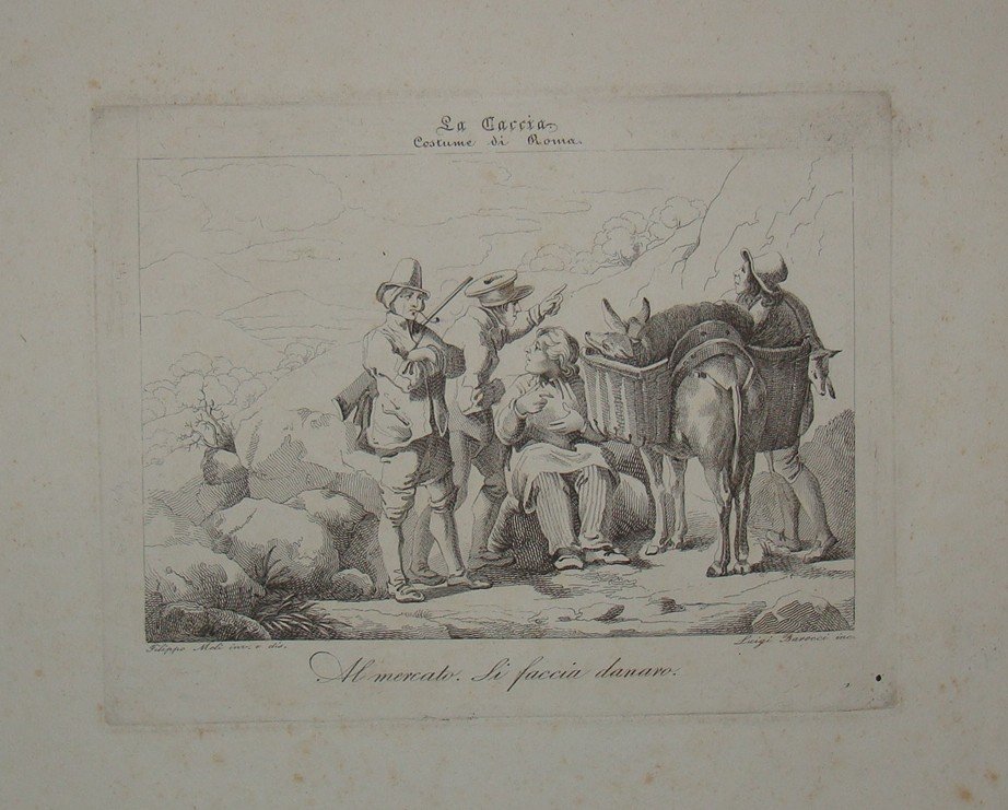 MELI F. Roma. La caccia. Al mercato. Si faccia danaro. 1830 ca. Incisione di Luigi Barocci da Filippo Meli. Cm. 12x18. Ampi margini.