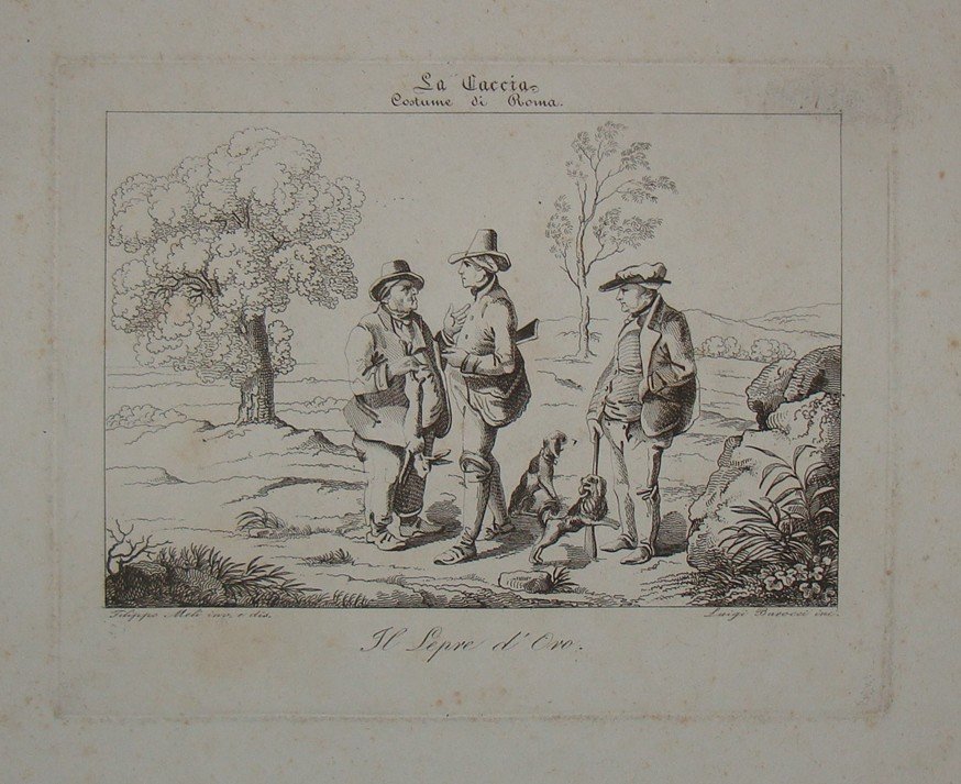MELI F. Roma. La caccia. Il lepre d’oro. 1830 ca. Incisione di Luigi Barocci da Filippo Meli. Cm. 12x18. Ampi margini.