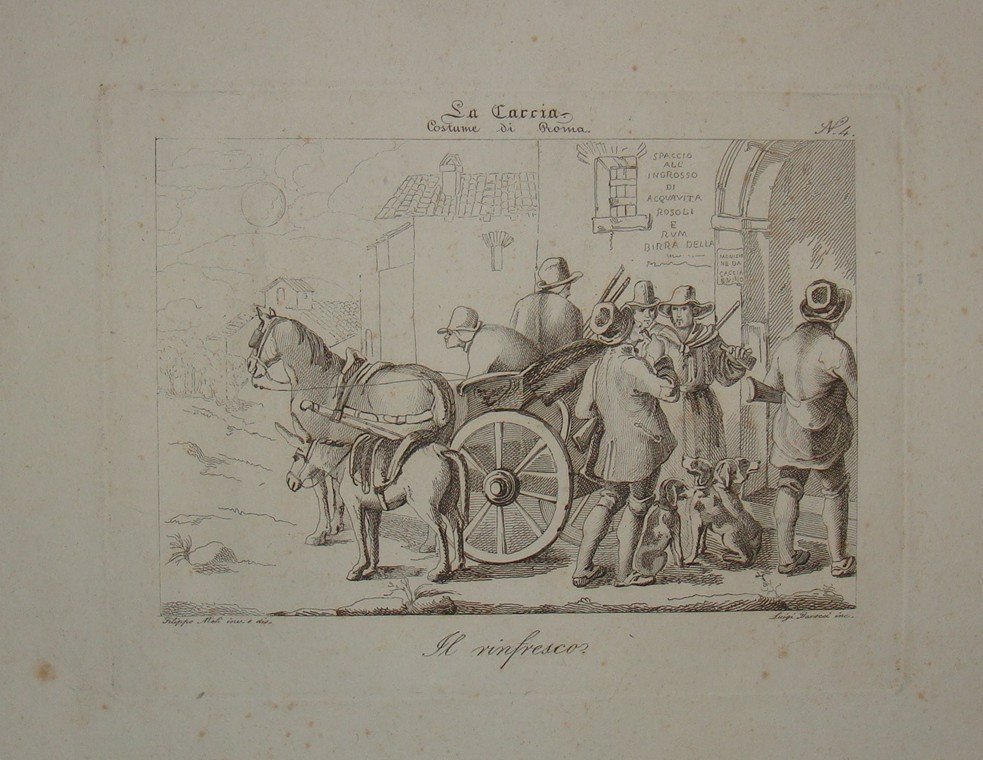 MELI F. Roma. La caccia. Il rinfresco. 1830 ca. Incisione di Luigi Barocci da Filippo Meli. Cm. 12x18. Ampi margini.