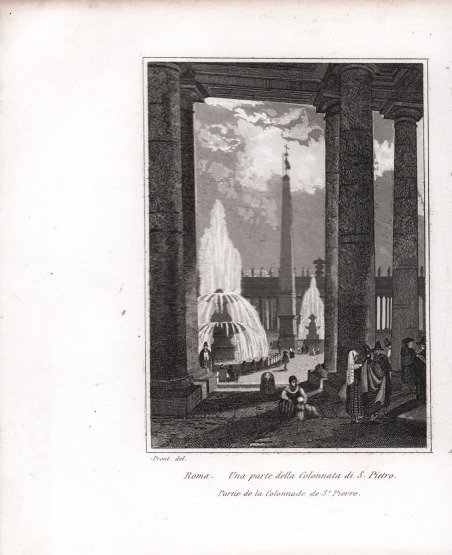 Veduta tratta dal celebre ' L'Italie, la Sicile, les Iles Éoliennes, l'Ile d'Elbe, la Sardaigne, Malte, l'Ile de Calypso etc. D'après les inspirations, les recherches et les travaux de M. M. le Vicomte de Chateaubriand, De Lamartine, Raoul-Rochette, le Comte de Forbin, Piranesi, Mazzara, et de Napoléon, Denon, Saint-Non, Lord Byron, Goethe, Visconti, Cicognara, Lanzi, de Bonstetten, Swinburne, etc. Sites, Monumens, Scènes et Costumes, d'après M.me Haudebourt-Lescot, MM. Horace-Vernet, Granet, Isabey, Ciceri, Mazzara, le Major Light, le Cap. Batty, Cooke, Gell et Gandy, Pinelli, Ferrari, Zucoli, et beaucoup d'autres artistes italiens. Recueillis et publiés par Audot Père, Membre de la Société de Géographie, ' edito a Parigi tra il 1834 ed il 1837 e ristampato a Torino [Giuseppe Pomba e Ca, 1834-1838]. L'opera, in cinque volumi, raccoglie scritti di autori vari, curati da Audot, ed è riccamente illustrata da 324 incisioni su acciaio fuori testo, molte delle quali con accostamento multiplo, per un totale di 473 tavole. Fu notoriamente mastodontico il lavoro cui si sottopose Louis Eustache Audot (1783-1870). View taken from the famous ' L'Italie, la Sicile, les Iles Éoliennes, l'Ile d'Elbe, la Sardaigne, Malte, l'Ile de Calypso etc. D'après les inspirations, les recherches et les travaux de M. M. le Vicomte de Chateaubriand, De Lamartine, Raoul-Rochette, le Comte de Forbin, Piranesi, Mazzara, et de Napoléon, Denon, Saint-Non, Lord Byron, Goethe, Visconti, Cicognara, Lanzi, de Bonstetten, Swinburne, etc. Sites, Monumens, Scènes et Costumes, d'après M.me Haudebourt-Lescot, MM. Horace-Vernet, Granet, Isabey, Ciceri, Mazzara, le Major Light, le Capt. Batty, Cooke, Gell et Gandy, Pinelli, Ferrari, Zucoli, et beaucoup d'autres artistes italiens. Recueillis et publiés par Audot Père, Membre de la Société de Géographie, ' published in Paris between 1834 and 1837 and reprinted in Turin [Giuseppe Pomba e Ca, 1834-1838]. The work, in five volumes, collects the writings of various authors, edited by Audot, and is richly illustrated with 324 engravings on steel outside the text, many of them with multiple combinations, for a total of 473 tables. Louis Eustache Audot (1783-1870) was a notoriously mammoth task. Cfr.