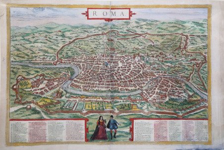 Sorprendente veduta a volo d'uccello di Roma con cartiglio decorativo con titolo, che mostra la città com'era nel 1550. Sono incluse varie strutture superstiti dell'antica Roma: le mura circostanti, il Pantheon, il Colosseo, l'Arco di Costantino e il Foro Romano. Nell'angolo sinistro in primo piano si possono vedere il Palazzo Papale e l'Obelisco dal circo di Caligola e Nerone. In basso due figure in primo piano e due ampie tabelle con la legenda."E' una copia ridotta della pianta del Camocio (o della precedente di Leon Pitor come sostiene Scaccia Scarafoni) nella quale la città è ritratta a volo d'uccello dal Gianicolo" (cfr. Marigliani p. 152). L’opera è inserita nel ' Civitates Orbis Terrarum, il primo atlante devoto esclusivamente alle piante e vedute delle principali città del mondo. Il primo volume delle ' Civitates Orbis Terrarum ' fu pubblicato a Colonia nel 1572. Il sesto e ultimo volume apparve nel 1617. Questo grande atlante di città – cartografia urbana - curato da Georg Braun e inciso in gran parte da Franz Hogenberg, conteneva 546 prospettive, vedute a volo d'uccello e vedute cartografiche di città di tutto il mondo. Franz Hogenberg realizzò le tavole dei primi quattro volumi e Simon van den Neuwel (Novellanus, attivo dal 1580) quelle dei volumi V e VI. Georg Braun (1541-1622), un ecclesiastico di Colonia, fu il principale redattore dell'opera e fu molto aiutato nel suo progetto dalla vicinanza e dal continuo interesse di Abraham Ortelius, il cui ' Theatrum Orbis Terrarum ' del 1570 fu, come raccolta sistematica e completa di mappe di stile uniforme, il primo vero atlante. Le ' Civitates, ' in effetti, erano destinate ad accompagnare il ' Theatrum, ' come indicato dalla somiglianza dei titoli e dai riferimenti contemporanei sulla natura complementare delle due opere. Tuttavia, le ' Civitates ' erano progettate per avere un approccio più popolare, senza dubbio perché la novità di una raccolta di piante e vedute di città rappresentava un'impresa commerciale più rischiosa di un atlante mondiale, per il quale c'erano stati diversi precedenti di successo. Franz Hogenberg (1535-1590) era figlio di un incisore di Monaco che si era stabilito a Malines. Incise la maggior parte delle tavole del ' Theatrum ' di Ortelius e la maggior parte di quelle delle ' Civitates, e potrebbe essere anche indicato come il responsabile dell'origine del progetto. Oltre un centinaio di artisti e cartografi diversi, il più importante dei quali fu l'artista di Anversa Georg Hoefnagel (1542-1600), fornirono i disegni per le tavole delle ' Civitates. Hoefnagel non solo contribuì alla maggior parte del materiale originale per le città spagnole e italiane, ma rielaborò e modificò anche quello di altri collaboratori. Dopo la morte di Hoefnagel, il figlio Jakob continuò il lavoro per le ' Civitates. Gli autori della raccolta si proponevano di raffigurare "non icones et typi urbium", cioè non immagini generiche e tipizzate, "sed urbes ipsae admirabili caelaturae artificio, spectantium oculis subiectae appareant": non intendeva alludere o idealizzare, ma rappresentare fedelmente sulla carta, riprodurre esattamente, e in tempo reale, ciò che l'occhio vede, come annunciato nella prefazione al primo volume delle ' Civitates Orbis Terrarum. Incisione in rame, finemente colorata a mano, lieve gora d'acqua nel margine inferiore destro, piega di carta centrale, per il resto in ottimo stato di conservazione.BibliografiaA. P. Frutaz, "Le piante di Roma", tav. 123; C. Marigliani, "Le Piante di Roma delle collezioni private", n. 52; M. Gori Sassoli (a cura di), "Roma Veduta" n. 12; Scaccia Scarafoni, "Le Piante di Roma", n. 156. Striking bird's-eye plan of Rome with decorative title cartouche, showing the city as it was c. 1550. Included are various surviving features of ancient Rome: the surrounding walls, the Pantheon, the Coliseum, the Arch of Constantine, and the Forum Romanum. In the left corner in the foreground can be seen the Papal Palace and the Obelisk from the circus of Caligula and Nero. With two figures in the foreground, and two extensive tables of explanations."E' una copia ridotta della pianta del Camocio (o della precedente di Leon Pitor come sostiene Scaccia Scarafoni) nella quale la città è ritratta a volo d'uccello dal Gianicolo" (cfr. Marigliani p. 152). The work is included in the ' Civitates Orbis Terrarum, the first atlas devoted exclusively to plans and views of the world's major cities. Printed in six volumes between 1572 and 1617 it was so successful and widespread that several editions translated into Latin, German and French were printed. The first volume of the ' Civitates Orbis Terrarum ' was published in Cologne in 1572. The sixth and the final volume appeared in 1617. This great city atlas, edited by Georg Braun and largely engraved by Franz Hogenberg, eventually contained 546 prospects, bird-eye views and map views of cities from all over the world. Fransz Hogenberg produced the plates for the first four books, and Simon van den Neuwel (Novellanus, active since 1580) those for volumes V and VI. Georg Braun (1541-1622), a cleric of Cologne, was the principal editor of the work, and was greatly assisted in his project by the close, and continued interest of Abraham Ortelius, whose ' Theatrum Orbis Terrarum ' of 1570 was, as a systematic and comprehensive collection of maps of uniform style, the first true atlas. The ' Civitates, ' indeed, was intended as a companion for the ' Theatrum, ' as indicated by the similarity in the titles and by contemporary references regarding the complementary nature of two works. Nevertheless, the ' Civitates ' was designs to be more popular in approach, no doubt because the novelty of a collection of city plans and views represented a more hazardous commercial undertaking than a world atlas, for which there had been a number of successful precedents. Franz Hogenberg (1535-1590) was the son of a Munich engraves who settled in Malines.