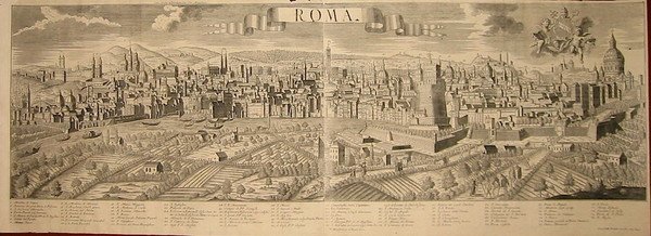 Incisione originale su rame (cm. 103,5x37,5 più margini bianchi) su due fogli uniti. Da un disegno di F.B. Werner, pubblicata da Georg Balthasar Probst. Carta vergellata con filigrana. Piccolo taglio senza alcuna perdita di parte incisa, un minuscolo forellino e lieve perdita di inchiostratura lungo la giunzione dei due fogli. Nel complesso esemplare in più che buono stato di conservazione ed in nitida impressione. Affascinante veduta a volo d’uccello della città di Roma di gusto tipicamente nord-europeo.