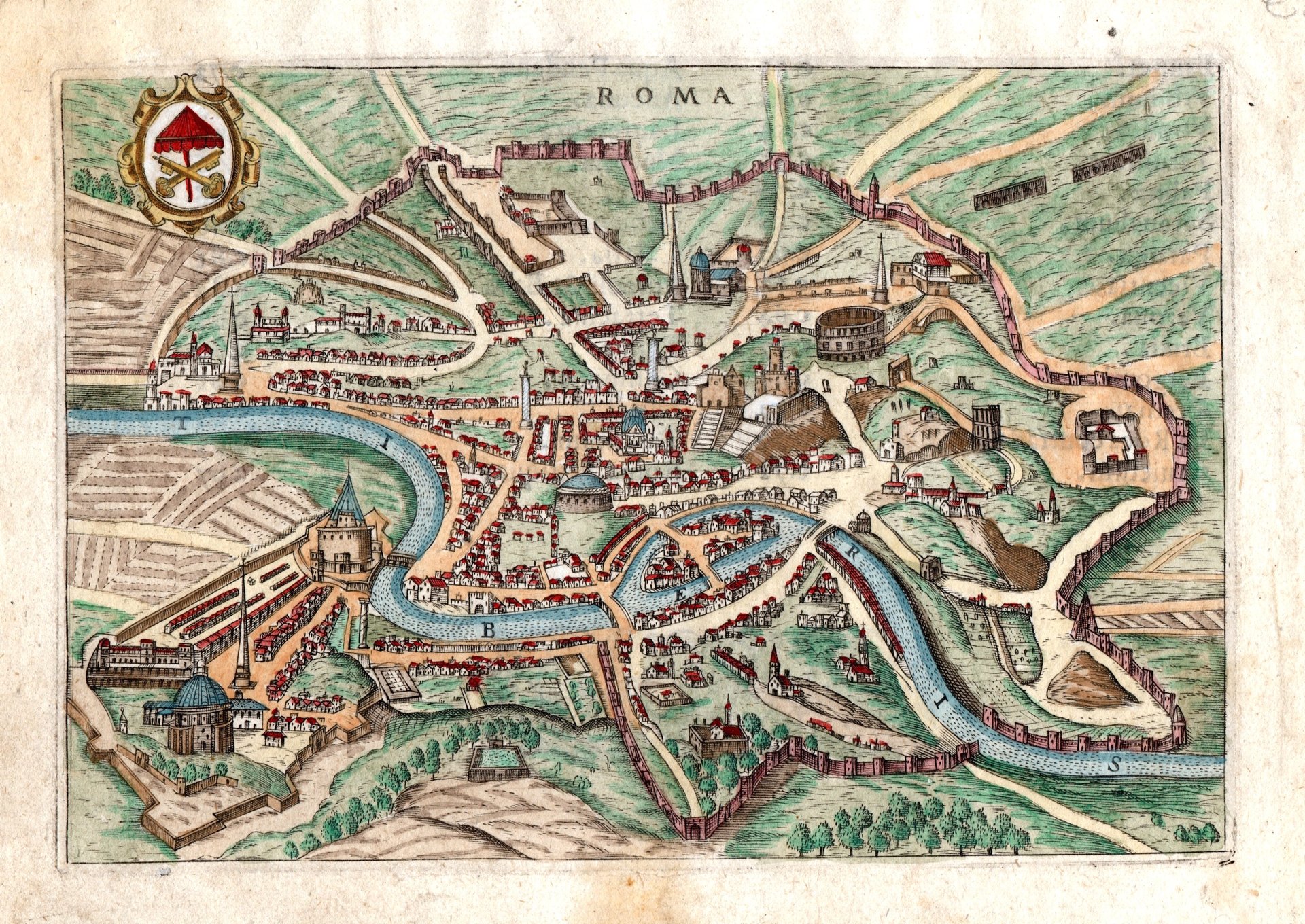 Incisione in rame, dipinta a mano, mm 120x175. Tratta da "Theatrum urbium Italicarum" prima edizione di questa raccolta di piante e vedute di città (senza dubbio da preferire per freschezza di stampa delle lastre alla successiva), ristampata successivamente a Vicenza nel 1616 da Domenico Amadio con l'aggiunta di alcune tavole (67 tavole invece delle 59 originali). Testo latino al verso, di autore ignoto, anche se alcuni studiosi ipotizzano sia dello stesso Bertelli. Generali lievi tracce del tempo ai margini.