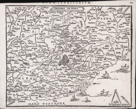 Piccola carta del Lazio, priva di data e indicazioni editoriali, stampata ad Amsterdam nel 1598 da Zacharias Heyns (1566 - 1630), tipografo, editore e incisore dei Paesi Bassi settentrionali. Tavola tratta da: Le miroir du monde ou epitome du Theatre d'Abraham Ortelius: auquel se represente, tant par figures que par characte?res, la vraye situation, nature et proprie?te? de la terre universelle. A Amsterdam: pour Zacharie Heyns, a? l’Enseigne des trois vertus. 1598. Si basa sul modello di Eufrosino della Volpaia, la Campagna di Roma del 1547, già tradotta più volte a stampa; nel mercato fiammingo fu Abraham Ortelius a pubblicarla nel Theatrum Orbis Terrarum del 1570. “La carta di Eufrosino Della Volpaia, si può considerare l’unica opera originale, per il XVI secolo, della Campagna Romana e venne presa a modello per numerose mappe del Lazio. Rivela strettissime analogie di contenuto con quanto riportato negli ' Otto libri di Domenico Bocca Maza quali narreno de varii et diverse cose apertinenti alli Cacciatori, ' stampati a Roma nel 1548. Almagià afferma: “Essa può definirsi una carta topografica, e tale è anche per la copia di particolari di ogni genere e per l’esattezza del disegno delle località, le cui figurazioni prospettiche corrispondono all’aspetto reale, quale è in molti casi ancora riconoscibile, e dimostrano una perfetta conoscenza personale della Regione. Altre figurazioni di vario genere, alcune delle quali singolarissime, porgono una viva immagine della Campagna Romana in quel tempo” (cfr. ' Cartografia e Topografia Italiana del XVI secolo ' p. 1961). Zacharias era figlio di Pieter Heyns, poeta e maestro di scuola di Anversa che scrisse il testo in rima per Le Miroir du Monde (1579) - edizione in lingua francese in prosa dello Spieghel der Werelt, il primo atlante tascabile di Abraham Ortelius pubblicato nel 1577 da Philip Galle e stampato ad Anversa dalla tipografia Plantin. Padre e figlio fuggirono da Anversa nel 1585 per trasferirsi a Francoforte prima e ad Haarlem poi. Zacharias si trasferì, quindi, ad Amsterdam, dove esercitò la professione di librario e successivamente di editore, con sede vicino all’Oude Kerk, dove stampava con il motto “a? l'Enseigne des trois vertus”. Nel 1598, dopo la morte del padre, pubblicò un piccolo atlante dello stesso titolo dell’epitome orteliana tradotta da Pieter Heyns: Le Miroir du Monde. Le mappe che compongono la raccolta sono realizzate in xilografia e non hanno nulla a che fare con le piccole mappe incise da Philip Galle per l’edizione originale de Le Miroir du Monde o Spieghel der Werelt. La provenienza delle carte xilografiche è abbastanza misteriosa; potrebbero essere di origine tedesca e risalenti al periodo trascorso a Francoforte in esilio. Nel 1599, Zacharias Heyns pubblicò una versione ridotta dell’opera con testo olandese, Den Nederland tschen Landtspiegel, contenente le sole mappe dei Paesi Bassi. Zacharias continuò a produrre varie opere, ma fu costretto ad abbandonare il progetto de Le Miroir du Monde, superato dalla competizione di un altro piccolo atlante: il Caert-Thresoor di Barent Langenes, che era apparso nelle librerie di Amsterdam nel 1598. Heyns si trasferì a Zwolle nel 1606, dove aprì una casa editrice situata dietro quello che oggi è il Vrouwenhuis. Nel 1615 le tavole xilografiche furono usate da Jan Janszoon di Arnhem per una nuova edizione de Le Miroir du Monde. Bibliografia C. Koeman, Atlantes Neerlandici: Bibliography of Terrestrial, Maritime and Celestial Atlases and Pilot Books Published in the Netherlands up to 1880, Vol. II, pp. 132-134, Z. Hey 1 (22). Piccola carta del Lazio, priva di data e indicazioni editoriali, stampata ad Amsterdam nel 1598 da Zacharias Heyns (1566 - 1630), tipografo, editore e incisore dei Paesi Bassi settentrionali. Tavola tratta da: ' Le miroir du monde ou epitome du Theatre d'Abraham Ortelius: auquel se represente, tant par figures que par characte?res, la vraye situation, nature et proprie?te? de la terre universelle. ' A Amsterdam: pour Zacharie Heyns, a? l’Enseigne des trois vertus. ' 1598. Si basa sul modello di Eufrosino della Volpaia, la ' Campagna di Roma del ' 1547, già tradotta più volte a stampa; nel mercato fiammingo fu Abraham Ortelius a pubblicarla nel ' Theatrum Orbis Terrarum ' del 1570. “La carta di Eufrosino Della Volpaia, si può considerare l’unica opera originale, per il XVI secolo, della Campagna Romana e venne presa a modello per numerose mappe del Lazio. Rivela strettissime analogie di contenuto con quanto riportato negli ' Otto libri di Domenico Bocca Maza quali narreno de varii et diverse cose apertinenti alli Cacciatori, ' stampati a Roma nel 1548. Almagià afferma: “Essa può definirsi una carta topografica, e tale è anche per la copia di particolari di ogni genere e per l’esattezza del disegno delle località, le cui figurazioni prospettiche corrispondono all’aspetto reale, quale è in molti casi ancora riconoscibile, e dimostrano una perfetta conoscenza personale della Regione. Altre figurazioni di vario genere, alcune delle quali singolarissime, porgono una viva immagine della Campagna Romana in quel tempo” (cfr. ' Cartografia e Topografia Italiana del XVI secolo ' p. 1961). Zacharias era figlio di Pieter Heyns, poeta e maestro di scuola di Anversa che scrisse il testo in rima per ' Le Miroir du Monde ' (1579) - edizione in lingua francese in prosa dello ' Spieghel der Werelt, il primo atlante tascabile di Abraham Ortelius pubblicato nel 1577 da Philip Galle e stampato ad Anversa dalla tipografia Plantin. Padre e figlio fuggirono da Anversa nel 1585 per trasferirsi a Francoforte prima e ad Haarlem poi. Zacharias si trasferì, quindi, ad Amsterdam, dove esercitò la professione di librario e successivamente di editore, con sede vicino all’Oude Kerk, dove stampava con il motto “a? l'Enseigne des trois vertus”. Nel 1598, dopo la morte del padre, pubblicò un piccolo atlante dello stess