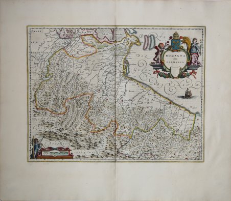 Suggestiva carta geografica della Romagna, pubblicata da Blaeu.La cartina mostra l'area tra Rimini, Cesena, Forlì, Imola e Ravenna e comprende un cartiglio decorativo con il titolo in alto a destra. Elegante carta eseguita sul modello di Magini. Willem Janszoon Blaeu, avviò nel 1599 la sua attività di costruttore di globi e strumenti astronomici ad Amsterdam. Nel 1630, dopo aver comprato alcune lastre dell’atlante del Mercator da Jodocus Hondius II, fu in grado di pubblicare un volume di 60 mappe con il titolo di ' Atlantis Appendix. Cinque anni dopo, pubblicò i primi due volumi del suo atlante ' Atlas Novus ' o ' Theatrum Orbis Terrarum, ' in sei libri. Dopo la sua morte, Joan (Johannes) continuò l’opera paterna, completando l’intera serie di sei volume dell’Atlas Novus ' intorno al 1655. Fu inoltre autore di un ' Atlas Maior sive Cosmographia Blaviana, in 12 volumi pubblicati nel 1662 -72, dei quali uno dedicato all'Italia. La carta compare per la prima volta nel terzo volume del ' Theatrum. ' Secondo Koeman viene pubblicata in primis nell'edizione francese del 1640, dal titolo ' Le Theatre du Monde ou Nouvel Atlas, ' Mis en lumiere par Guillaume & Jean Blaeu. ' Troisieme partie. A Amsterdam, Chez Iean & Corneille Blaeu MDCXL. Il terzo volume del ' Theatrum ' contiene 58 carte dell'Italia e 4 della Grecia (cfr. Koeman, ' Atlas Neerlandici, pp. 160-162, Bl 35A). Le carte dell'italia derivano tutte dall'opera di Giovanni Antonio Magini. Tuttavia, sembra più probabile che il Blaeu si basi sue quelle di Hendrick Hondius e Johannes Janssonius pubblicate nel ' Theatrum Italiae in quo Eius Regna, Domina, Ducatus, Et Speciatim Illorum Provinciae, Tabulis Accuratissimis, Iam, De Novo in Lucem Editio, Describunter, Quorum Sequens Pagina Indicabit, stampato ad Amsterdam da Hendrick Hondius nel 1636. ' Sebbene pubblicate dopo la morte di Willem Janszoon Blaeu (1638) le carte spesso recano il suo imprint. Non è dato sapere se fossero tutte già pronte o se i figli Johannes e Cornelis le compilarono postume. Incisione in rame con coloritura coeva in generale in buone condizioni. Striking regional map of Romagna, published by Blaeu.The map shows the area between Rimini, Cesena, Forli, Imola and Ravenna and includes a decorative cartouche. Willem Janszoon Blaeu, started in 1599 his business as a builder of globes and astronomical instruments in Amsterdam. In 1630, after buying some plates of the Mercator atlas from Jodocus Hondius II, he was able to publish a volume of 60 maps under the title ' Atlantis Appendix. Five years later, he published the first two volumes of his atlas ' Atlas Novus ' or ' Theatrum Orbis Terrarum, in six books. After his death, Joan (Johannes) continued his father's work, completing the entire six-volume ' Atlas Novus ' series around 1655. He was also the author of an ' Atlas Maior sive Cosmographia Blaviana, in 12 volumes published in 1662 -72, one of which was devoted to Italy. The map first appears in the third volume of the Theatrum. According to Koeman it is first published in the French edition of 1640, entitled Le Theatre du Monde ou Nouvel Atlas, Mis en lumiere par Guillaume & Jean Blaeu. Troisieme partie. In Amsterdam, Chez Iean & Corneille Blaeu MDCXL. The third volume of the Theatrum contains 58 maps of Italy and 4 of Greece (see Koeman, Atlas Neerlandici, pp. 160-162, Bl 35A). The maps of Italy are all derived from the work of Giovanni Antonio Magini. However, it seems more likely that Blaeu relies on those of Hendrick Hondius and Johannes Janssonius published in Theatrum Italiae in quo Eius Regna, Domina, Ducatus, Et Speciatim Illorum Provinciae, Tabulis Accuratissimis, Iam, De Novo in Lucem Editio, Describunter, Quorum Sequens Pagina Indicabit, printed in Amsterdam by Hendrick Hondius in 1636. Although published after the death of Willem Janszoon Blaeu (1638) the maps often bear his imprint. It is not known whether they were all ready-made or if his sons Johannes and Cornelis completed them posthumously. Copperplate with original colour, some foxing, generally in very god condition. Cfr.