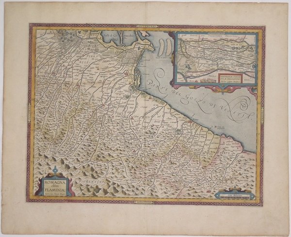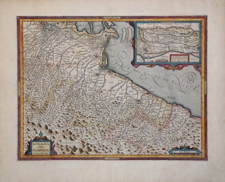 Rara carta della Romagna tratta dal Theatrum Orbis Terrarum di Ortelius nell'edizione del Vrients del 1612 con testo spagnolo al verso. In alto a destra piccola carta denominata Rhodiginae peninsulae descriptio. Si tratta di una delle opere aggiunte da Vrients; la carta compare per la prima volta nell'edizione italiana del Theatrum che uscì ad Anversa nel 1608, pubblicata dal Vrients. Riedizioni successive dell'atlante, senza variazioni, vi furono nel 1612 in versione latina, italiana e spagnola a cura delle celebre officina Plantiniana. La carta deriva in tutto e per tutto da quella di Giovanni Antonio Magini del 1597, mentre la carta di Rovigo da quella di Giovanni Bonifacio del 1602. Il Theatrum Orbis Terrarum ' è considerato il primo vero “atlante” moderno. L’opera fu pubblicata in 7 lingue e 36 edizioni, per il quale – nel 1570 - Ortelius ottenne il privilegio, ovvero una sorta di diritto d'autore che impediva ad altri cartografi di pubblicare i propri lavori. Il Theatrum rappresentava il lavoro più avanzato del lavoro della descrizione cartografica. L’Ortelius vi raccolse il sapere geografico e cartografico del suo tempo, proponendo in 147 spettacolari tavole incise l’immagine più fedele del mondo allora conosciuto e, in alcune straordinarie “carte storiche”, regioni e itinerari tratti dalla letteratura, dalla mitologia, dalla tradizione. Ortelius fu anche il primo a citare le fonti, menzionando i nomi dei cartografi nel “catalogus auctorum”. Dal 1598 al 1612 le edizioni postume del Theatrum furono realizzate dal suo collaboratore Johannes Baptiste Vrients. ' Incisione in rame, coloritura coeva, in perfetto stato di conservazione. Rara. Map taken from the Theatrum Orbis Terrarum, which is considered the first true modern "Atlas". The work was published in 7 languages and 36 editions, for which - in 1570 - Ortelius obtained the privilege, a kind of copyright that prevented other cartographers from publishing his works. The Theatrum represented the most advanced work of cartographic description. Ortelius collected in it the geographical and cartographic knowledge of his time, proposing in 147 spectacular engraved plates the most faithful image of the world then known and, in some extraordinary "historical maps", regions and routes taken from literature, mythology, tradition. Ortelius was also the first to cite sources, mentioning the names of cartographers in the "catalogus auctorum". From 1598 to 1612 the posthumous editions of the Theatrum were made by his collaborator Johannes Baptiste Vrients. Copper engraving, contemporary coloring, in good condition. Cfr. Faini Majoli, "La Romagna nella cartografia…" p. 25, 5.