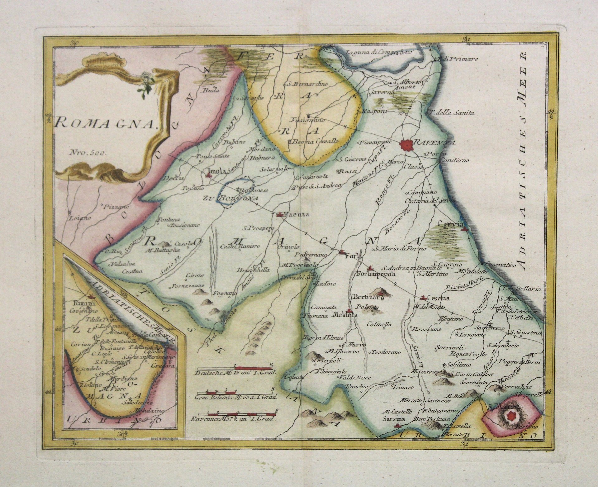 Incisione in rame, dipinta d’epoca e ritoccata a mano posteriormente, mm 220x270. Tratta dal conosciuto atlante “Schauplatz…der Welt” pubblicato da Reilly fra il 1789 e il 1806. Raffigura tutta la Romagna con un riquadro della zona a sud di Rimini. Perfetta.