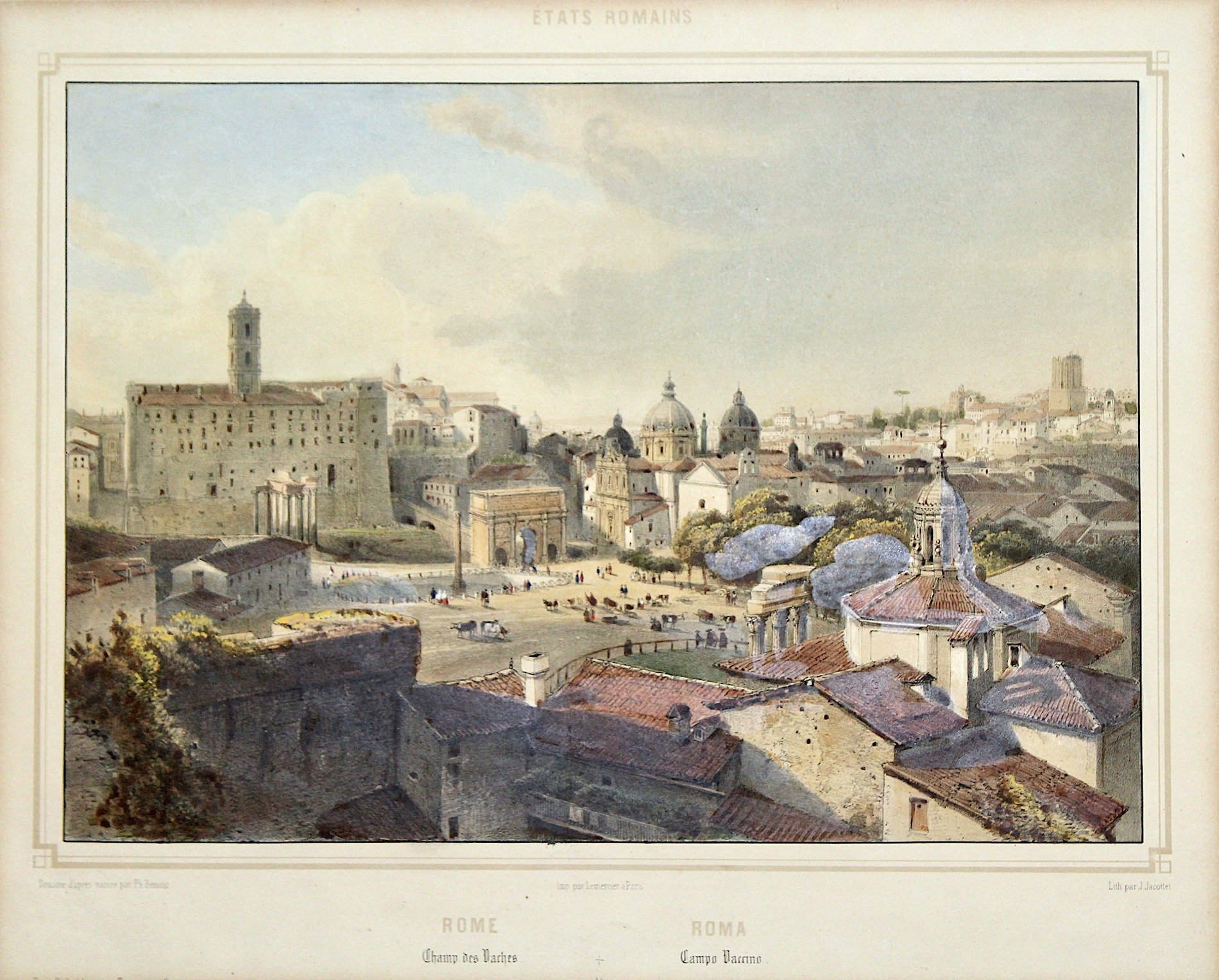 Litografia, dipinta magnificamente d’epoca “a la gomme”, mm 194x273. Bella scorcio del Foro; veduta animata, eseguita su disegno di Benoist, stampata da Lemercier. Assai marginosa e perfettamente conservata, anche se con traccia evidente di ossidazione ai margini, a causa di una precedente montatura in passe-partout.