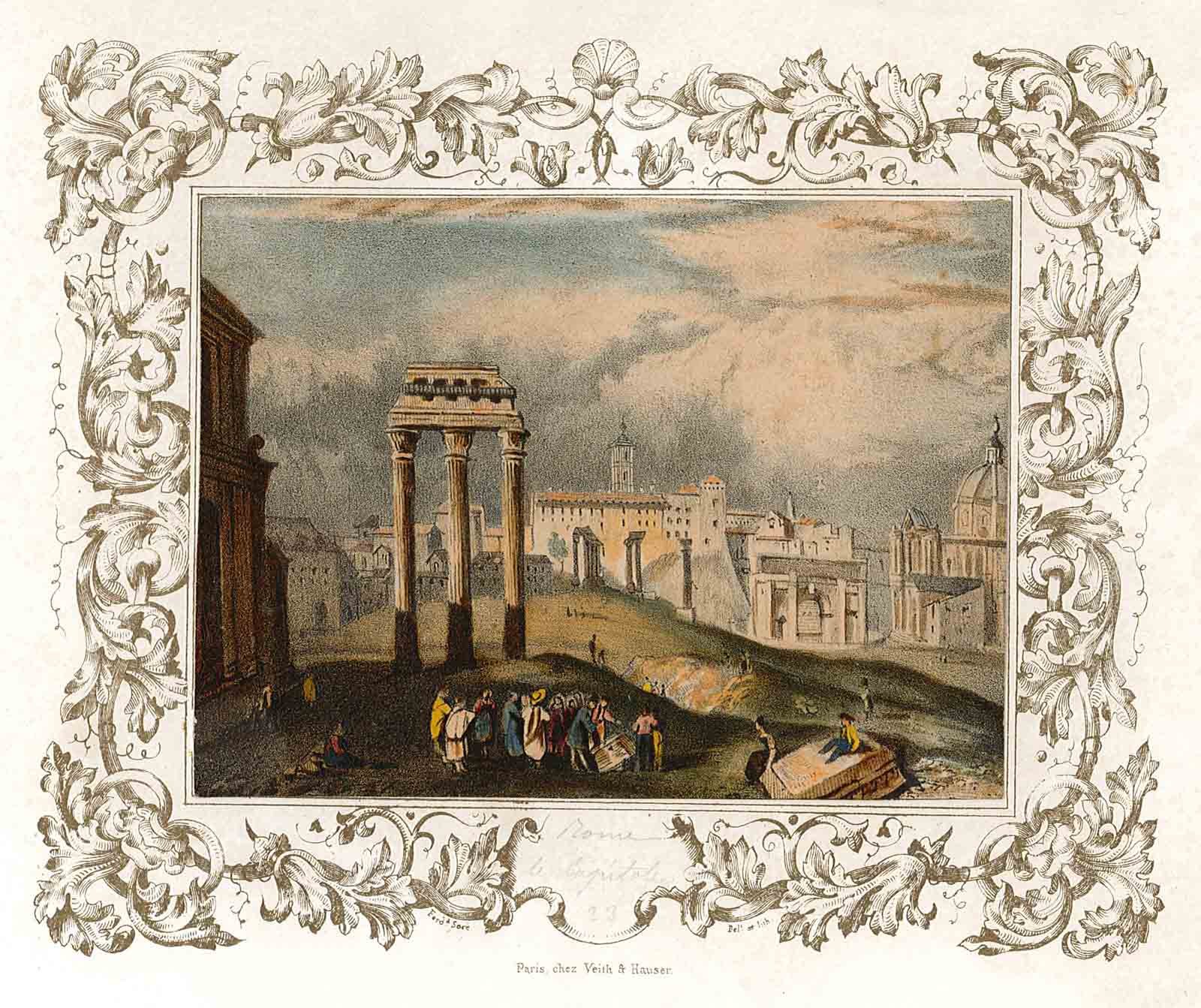 Graziosa e rara veduta del Campidoglio e dei Fori Imperiali. L'incisione è arricchita da decorativa cornice a motivi floreale a cura di Ferd. Seré. Vivace coloritura coeva