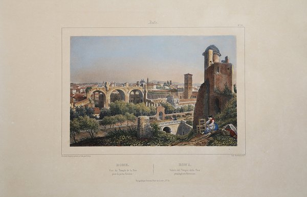 Tavola tratta dalla serie di vedute dal titolo "L'Italie, collection des sites les plus renommés et des Monumens les plus remarquables de ce pays".Disegnata e litografata da Isidor L. Deroy per l'editore Jeannin di Parigi.Litografia, finemente colorata a mano, in ottimo stato di conservazione. View taken from "L'Italie, collection des sites les plus renommés et des Monumens les plus remarquables de ce pays".Designed and lithographed by Deroy for the publisher Jeannin of Paris.Litograph with fine hand colouring, excellent condition. Cfr.