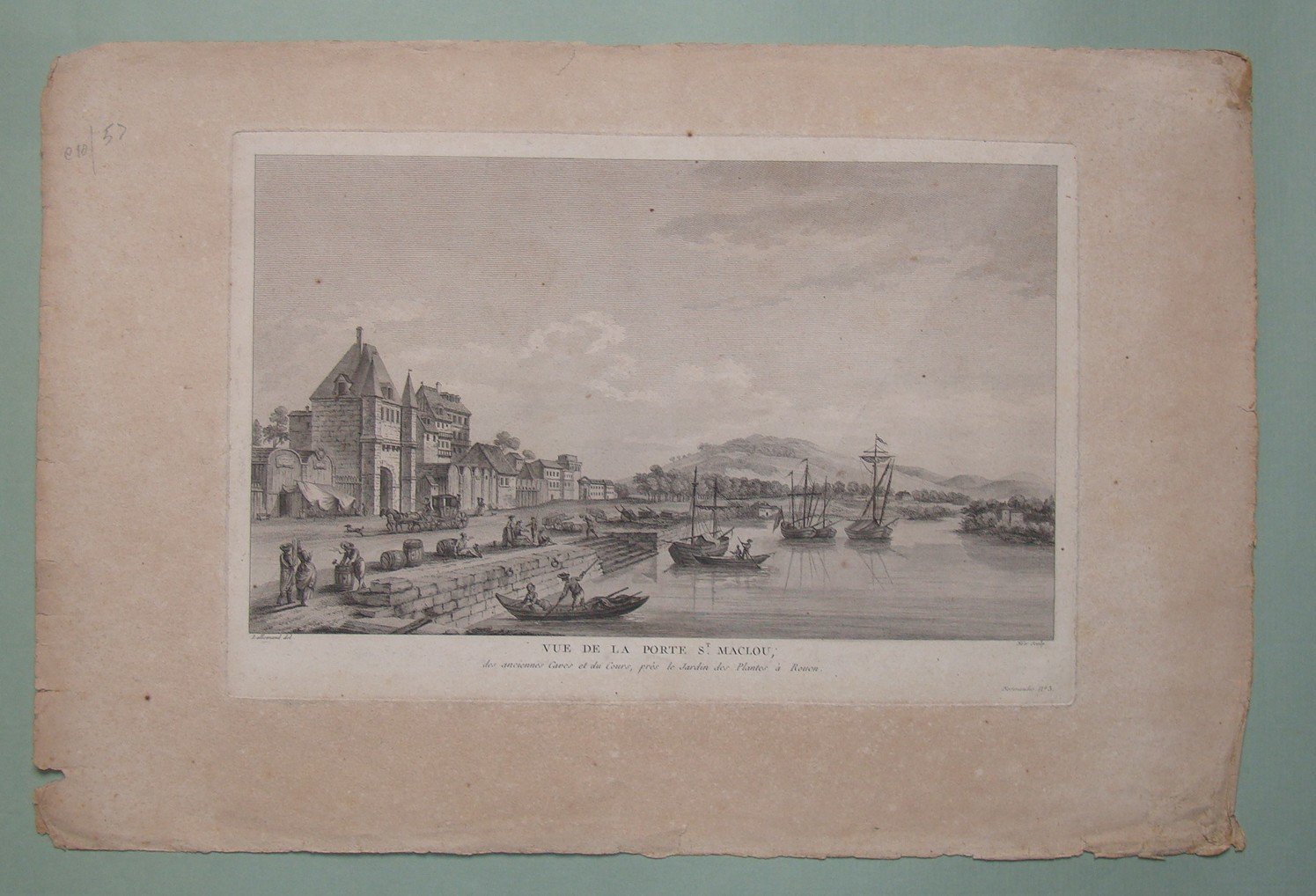 NEE. Rouen. Vue de la Porte St. Maclou; des anciens Caves et du Cours, près le Jardin des Plantes à Rouen. 1780 ca. Etching by Née, Lallemand del. Cm.21x34.