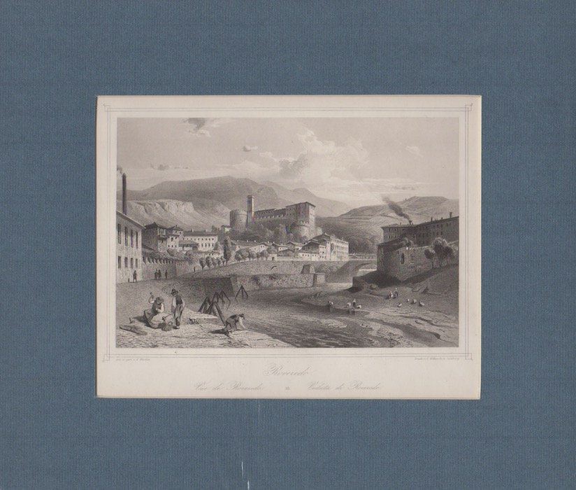 Incisione in acciaio di dimensioni 140x207 mm, in passepartout. Condizioni : USATO - Stato : Buono, ordinari segni d'uso e del tempo. Altre note : Veduta di Rovereto disegnata e incisa da Friedrich Karl Würthle. Il motivo consolidato del ponte nuovo sul Leno con il castello sullo sfondo è qui animato in primo piano da attività quotidiane, a testimoniare la vitalità e serenità del luogo. Scheda bibliografica tratta da "Trento illustrata: la città e il territorio in piante e vedute dal XVI al XX secolo" di Aldo Chemelli e Carlo e Marcus Perini, scheda n. 58.