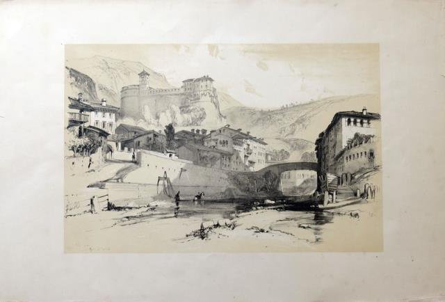 In basso a sn. titolata e datata “Sept. 1834” (non firmata ma della stessa serie di quelle relative a Trento con tale firma). Tono litografia con delicate porzioni di bianco a dare luce e colore, cm 36,8 x 55 (il foglio). Veduta del castello della città di Rovereto con scorcio del ponte e animata da piccole figure in lontananza. Normali difetti marginali ma buono stato di conservazione. .