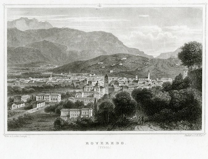 Incisione in acciaio 106x167 mm. Condizioni : USATO - Stato : Buono, ordinari segni d'uso e del tempo. Altre note : Veduta di Rovereto, con i colli e i monti circostanti. In centro il campanile e la chiesa di S. Marco. Disegno e litografia sono di Ludwig Lange, l'incisore è Georg Michaël Kurz. Scheda bibliografica tratta da "Trento illustrata: la città e il territorio in piante e vedute dal XVI al XX secolo" di Aldo Chemelli e Carlo e Marcus Perini, scheda n. 56. Disponibile a colori.