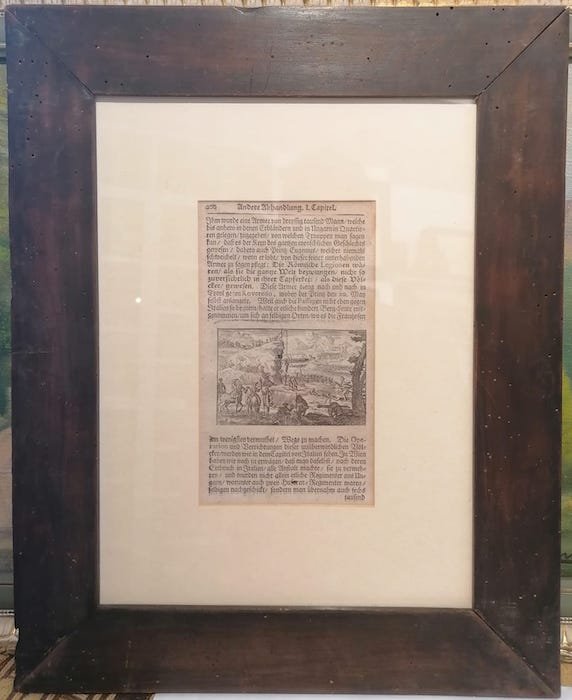 Incisione su rame di dimensioni 55x85 mm. Condizioni : USATO - Stato : Buono, ordinari segni d'uso e del tempo. Altre note : Piccola incisione raffigurante scene di battaglia nella zona di Rovereto contenuta probabilmente nel "Neu eröffneter historischer Bilder Saal", testo storico incentrato sul periodo che va dal 1700 al 1704 di cui non si conosce con certezza l'autore. Sul lato superiore e a verso testo a caratteri gotici. Disponibile copia in cornice.