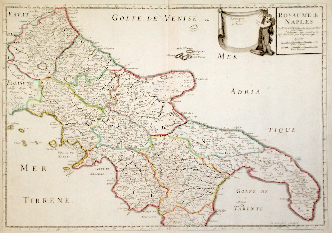 Incisione in rame, colorata d'epoca ai confini, mm 415x585. Rara edizione, che presenta cancellature al titolo, relative al nome del re che concesse il privilegio ed allo stampatore, con data variata a 1703, rispetto all'edizione seicentesca. Inoltre alla carta è stato aggiunto il putto che sorregge il drappo. Sanson, geografo del Re Luigi XIII è considerato il fondatore della cartografia francese, tra i primi ad applicare la trigonometria nelle misurazioni geodetiche; infatti Nicolas Sanson e i suoi collaboratori realizzarono nuove proiezioni geografiche e pubblicarono numerosi atlanti, mentre si affermava l'impiego dei sistemi di misura indiretta mediante i procedimenti trigonometrici applicati in Olanda da Snellius fin dal 1617. Il rilevamento geodetico-topografico basato sulla triangolazione prese rapidamente piede dando alle carte geografiche un aspetto sempre più aderente alla realtà che rappresentavano.<BR>Bellissimo esemplare con lieve alone marginale in basso a destra. <BR>