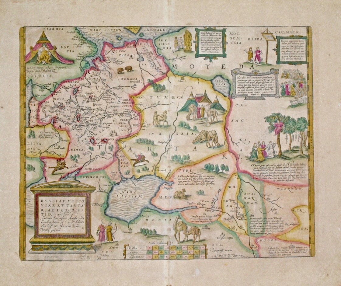 Incisione in rame, colorata d’epoca, mm 350x445, ricca di fascinose raffigurazioni di animali e scene di vita delle popolazioni indigene; tratta dall’originale disegnato dal mercante inglese Jenkinson della “English Muscovy Company”, disegnato nel 1562. Egli viaggiò spesso in Russia e Bukhara verso la fine degli anni ’50. Inserita dalla prima edizione in "Theatrum Orbis Terrarum" il primo atlante moderno, comprendente carte di tutte le zone del mondo; la geniale intuizione di Ortels, latinizzato successivamente, fu appunto questa: prima d'allora la produzione cartografica era stata irregolare, locale a livello di produzione ed i pochi atlanti, i cosiddetti "Atlanti Lafreriani" erano costituiti su richiesta raccogliendo carte di alcune zone, ignorando le altre. Ortelius riunì in un unico corpus la produzione cartografica eterogenea del periodo, costituendo la base per un'impresa editoriale di enorme successo, pubblicata dal 1570 al 1612. Questo esemplare proviene dall’ultima edizione latina del 1612; in bella coloritura antica, molto ben conservato sebbene su carta brunita, comune nelle ultime edizioni, ampi margini. Restauro ai margini est. della piega centrale. Van den Broecke, 162.
