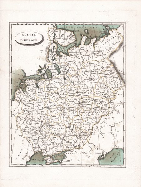 Carta geografica tratta dalla ' Géographie moderne, rédigée sur un nouveau plan, ou Description historique, politique, civile et naturelle des empires, royaumes, Etats et leurs colonies.: renfermant la concordance des principaux points de la géographie ancienne et du moyen âge, avec la géographie modern ' traduzione francese del trattato di Geografia di John Pinkerton, pubblicato a Parigi nel 1804. Le carte geografiche sono elaborate da Jean-Nicolas Buache su quelle disegnate da Aaron Arrowsmith per l’edizione inglese del trattato di Pinkerton. Jean-Nicolas Buache de La Neuville è stato un idrografo e geografo francese attivo tra la fine del XVIII e l'inizio del XIX secolo. Direttore del Dépôt des Cartes de la Marine, fu l'ultimo a fregiarsi del titolo di “primo geografo del re”. Eletto membro dell'Accademia delle Scienze nel 1770, fu incaricato da Luigi XVI di redigere nel 1788 le mappe dei baliati del regno di Francia. J. N. Buache era un ardente sostenitore delle idee cartografiche radicali di suo zio, Phillip Buache, riguardo all'ipotizzata esistenza di un "passaggio a nord-ovest". Come Phillip, Jean Nicholas credeva che la cartografia teorica, cioè l'applicazione delle teorie geografiche, potesse riempire i luoghi vuoti del globo prima che gli esploratori reali vi si recassero. Acquaforte con bellissima coloritura coeva, in ottimo stato di conservazione. Map taken from ' Géographie moderne, rédigée sur un nouveau plan, ou Description historique, politique, civile et naturelle des empires, royaumes, Etats et leurs colonies.: renfermant la concordance des principaux points de la géographie ancienne et du moyen âge, avec la géographie modern ' French translation of John Pinkerton's treatise on Geography, published in Paris in 1804. The maps are elaborated by Jean-Nicolas Buache on those drawn by Aaron Arrowsmith for the English edition of Pinkerton's treatise. Jean-Nicolas Buache de La Neuville was a French hydrographer and geographer active in the late 18th and early 19th centuries. Director of the Dépôt des Cartes de la Marine, he was the last to hold the title "first geographer to the king." Elected a member of the Academy of Sciences in 1770, he was commissioned by Louis XVI to draw up maps of the bailiwicks of the kingdom of France in 1788. J. N. Buache was an ardent supporter of the radical cartographic ideas of his uncle, Phillip Buache, regarding the hypothesized existence of a "northwest passage." Like Phillip, Jean Nicholas believed that theoretical cartography, that is, the application of geographical theories, could fill in the empty places on the globe before actual explorers went there. Etching with beautiful contemporary coloring, in excellent condition. Cfr.