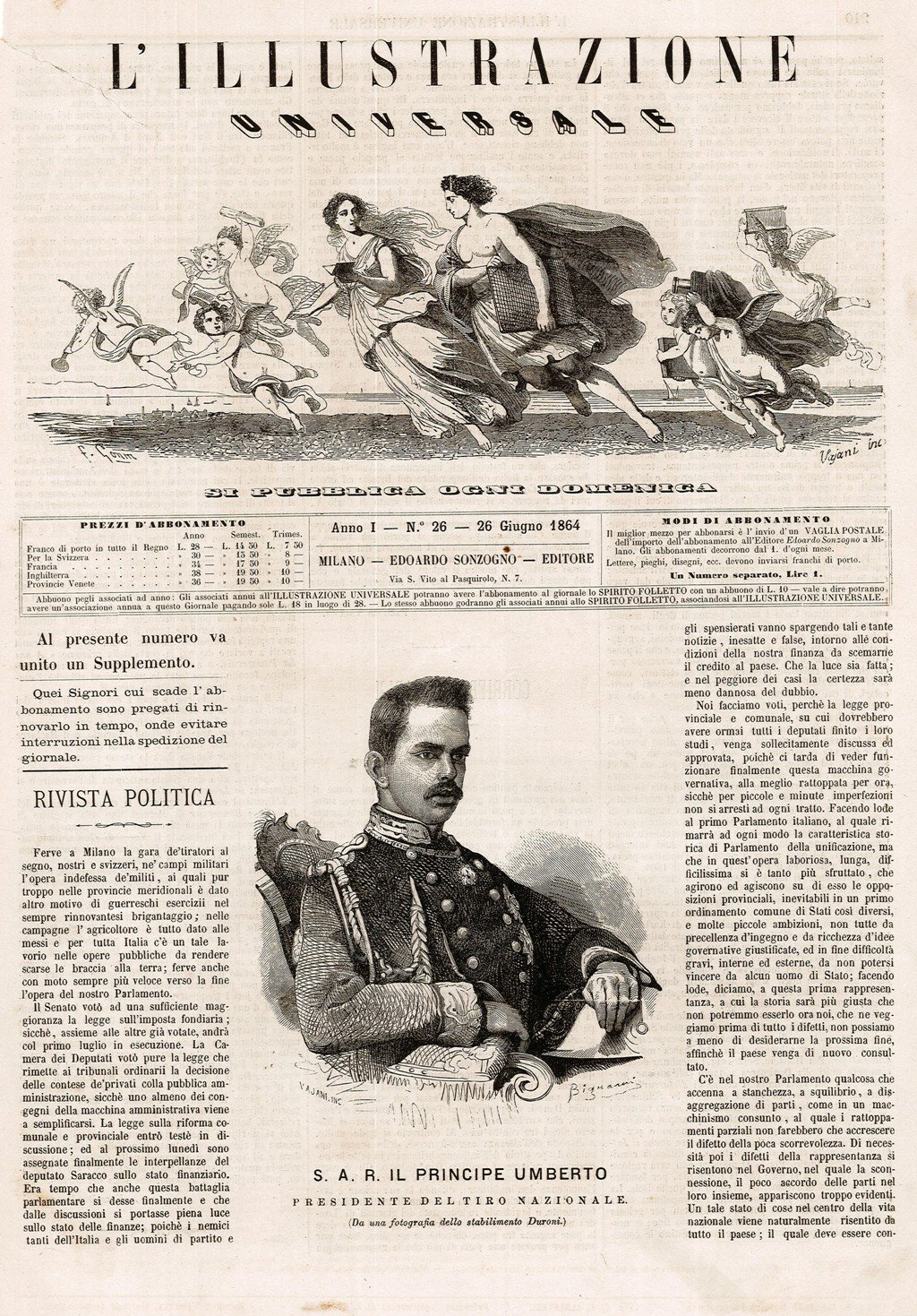 Stampa, antica ed originale, raffigurante il ritratto del Principe Umberto. Inserita in una rara pubblicazione, edita dall'Editore Edoardo Sonzogno, spesso non inserita nelle bibliografie di riferimento. Testo al retro