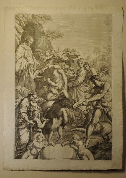 Incisione all'acquaforte di mm 375 x 560 alla battuta su carta vergata. I stato su II. Prima tiratura ante litteram di quello che verrà un secolo più tardi pubblicato come "Il Claustro di San. Michele in Bosco di Bologna de' monaci olivetani dipinto dal famoso Lodovico Carracci e da altri eccellenti maestri usciti dalla sua Scuola". Bologna, Impresso nelle Stampe Dalla Volpe, l'Anno 1776. La storia della pubblicazione di questo volume fu piuttosto complessa; la prima opera organica che tentasse di perpetuare il ricordo del magnifico complesso del Chiostro venne ideata dal canonico conte Carlo Cesare Malvasia (1616-1693). Egli richiese all'amico pittore e incisore Giacomo Giovannini di fornirgli le illustrazioni per un suo volume sul Chiostro, ma la pubblicazione di quell'opera poté avvenire solamente un anno dopo la morte del suo promotore, nel 1694, e risultò incompleta poichè si rinunciò ad inserirvi le riproduzioni delle scene più guaste. Fu necessario attendere altri 82 anni per salutare finalmente la pubblicazione di un opera organica e completa sul chiostro ottagonale di S.Michele in Bosco e, soprattutto, sul suo ciclo pittorico il cui deperimento non conosceva soste. Questa volta l'idea partì da uno stampatore, Petronio Dalla Volpe, il quale ebbe la segreta intenzione di creare con quell'opera il suo capolavoro tipografico e che seppe coinvolgere nell'impresa un gruppo di artisti e letterati d'indubbia fama e capacità. Il Dalla Volpe affidò lo studio introduttivo ed il commento ad ogni dipinto del chiostro a Giampietro Cavazzoni Zanotti(1674-1765). Nonostante varie traversie, fra cui la morte dello stesso Zanotti, nel 1776 , dopo almeno 16 anni di lavoro, il volume venne alla luce ed è da esso che traiamo l'elenco delle opere e degli autori che operarono nel Chiostro.