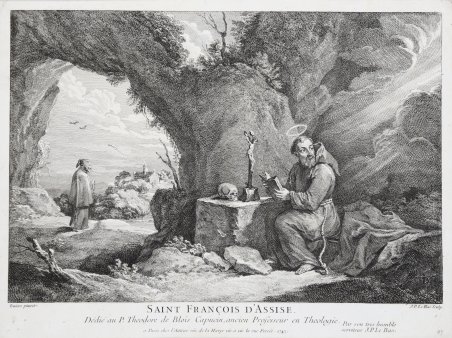 Acquaforte e bulino, 1743, firmata in lastra in basso. Da un soggetto di David Teniers il Giovane. San Francesco d'Assisi indossa una cappuccina e prega in una grotta, guardando alle sue spalle un raggio di luce proveniente dall'alto; un crocifisso e un teschio su un blocco di fronte a lui, un altro monaco in piedi fuori dall'entrata della caverna. Ottima prova, su carta vergata coeva, rifilata al rame, in ottime condizioni. Etching and engraving, 1743, signed on plate. St Francis of Assisi wearing a capuchin habit and praying in a cave, looking over his shoulder at a ray of light coming from top right, a crucifix and a skull on a block in front of him, another monk standing outside the cave entrance; after David Teniers the Younger. Lettered in lower margin with production details: “Teniers pinxit.” and “J.P. Le Bas Sculp.” and “Dedié au P. Theodor de Blois Capucin, ancien Professeur en Theologie / Par son tres humble / serviteur J.P. Le Bas” and “a Paris chez l'Auteur rüe de la Harpe vis a vis la rue Percée. 1743”. Trimmed to the borderline, good condition. Cfr. Inventaire du Fonds Français: Bibliothèque Nationale, Département des Estampes, Paris, 1930, (Le Bas), n. 30.