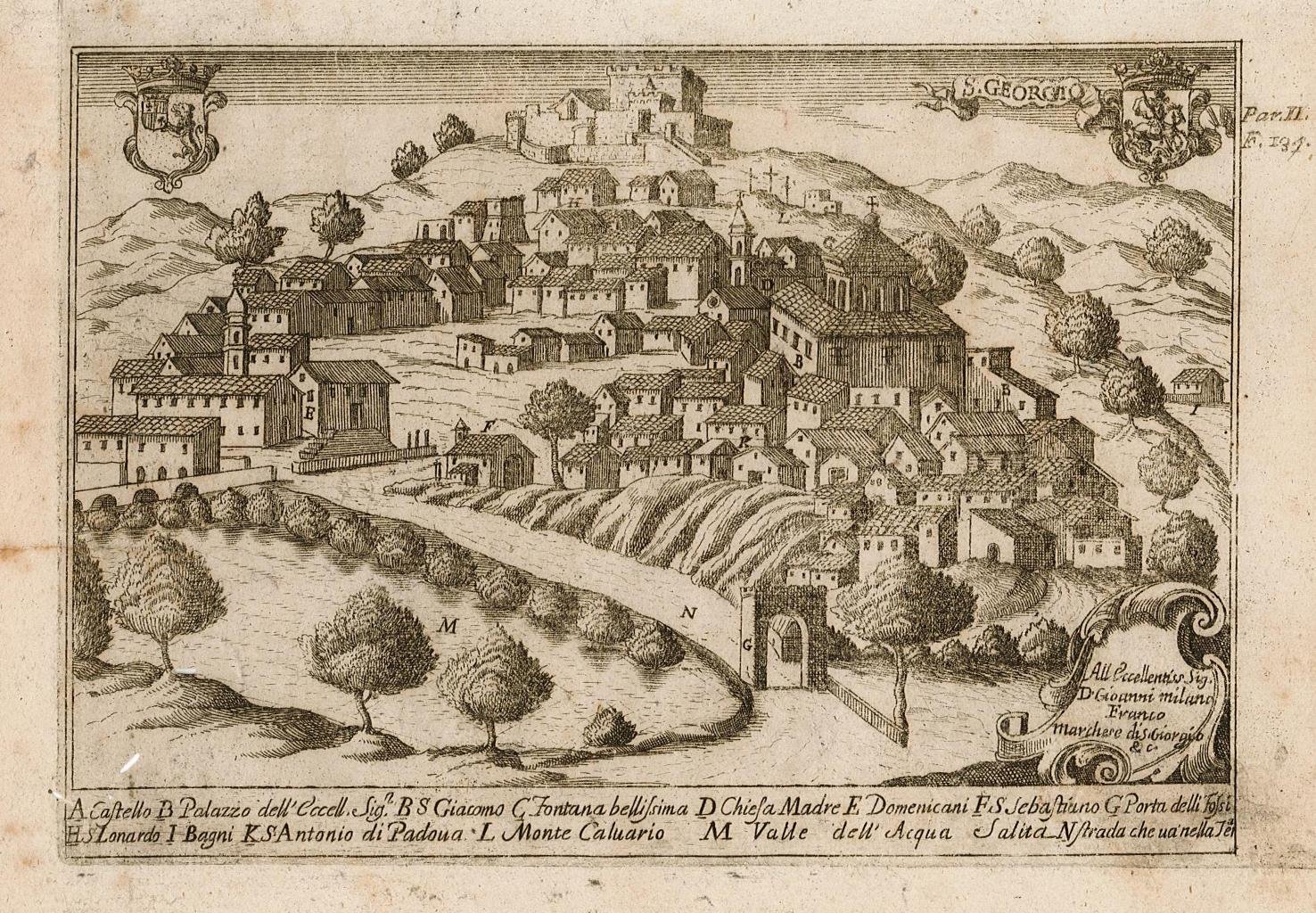 Stampa, antica ed originale, con veduta della cittadina, in calce rimandi da A a N. Autore: Pacichelli Gio. Battista. Luogo: San Giorgio - Calabria. Anno: 1703. Tecnica: incisione in rame. Dimensioni: 125x180. Tratta dalla rara opera "Il Regno di Napoli / in prospettiva / diviso in dodeci provincie." pubblicata a Napoli da Michele L. Mutio nel 1703. Incisione stampata con inchiostro bruno