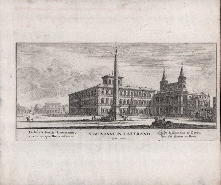 Veduta tratta dalla serie ' Les stations de Rome. ' Il Silvestre, incisore e disegnatore, nasce a Nancy nel 1621. Come era consuetudine all'epoca, fece diversi viaggi in Italia per copiare i vecchi maestri e per migliorare le sue abilità con i più grandi maestri. Faucheux fissa le date di questi viaggi, il primo prima del 1640 (Israel non aveva ancora 20 anni), il secondo dal 1643 al 1644 e l'ultimo intorno al 1653. Israel portò con sé molte vedute dell'Italia, quasi tutte incise. Fino al 1659, fece altri viaggi in Francia e in Lorena, da cui trasse molti disegni e incisioni. Il suo stile fu, all'inizio, piuttosto sciolto, ma dal 1643 in poi divenne più raffinato e delicato, acquisendo accuratezza e precisione senza essere asciutto, risultando a volte simile a quello di Jacques Callot o di Stefano della Bella, con i quali ebbe rapporti di amicizia attraverso il suo zio materno e mentore, l’editore Israël Henriet. Accanto alle testimonianze per la Roma antica mostrò ben presto un grandissimo interesse per la città "moderna", divenendo uno dei precursori del vedutismo - non solo nel campo incisorio - anticipando artisti come Lievin Cruyl e Gaspar van Wittel. È praticamente impossibile fare un inventario completo delle opere di Israël Silvestre, tanto era prolifico l'artista. Ha lasciato numerosi disegni e più di mille incisioni. Tra le sue opere più belle, possiamo tuttavia menzionare le numerose e complesse “piccole” suite (composte da poche tavole) sulle piazze, le chiese e le antichità di Roma. Acquaforte, in ottimo stato di conservazione. Bibliografia L. E. Faucheux, Catalogue raisonné de toutes les estampes qui forment l'oeuvre d'Israel Silvestre: précédé d'une notice sur sa vie (1857), n. 2.4; F. Baré, Israël Silvestre et sa famille, suivi du catalogue de son oeuvre (1885), n. 810. View taken from the series ' Les stations de Rome. ' Les stations de Rome, suite of 10 numbered pieces, not including the title. The inscriptions of this suite are in French (italic characters) and in Latin (Roman characters). The title of each piece which separates the Latin inscription from the French inscription is in Italian and in large characters. Silvestre, engraver and draftsman, was born in Nancy in 1621. As was customary at the time, he made several trips to Italy to copy the old masters and to improve his skills with the greatest masters. Faucheux fixes the dates of these trips, the first before 1640 (Israel was not yet 20 years old), the second from 1643 to 1644 and the last around 1653. Israel brought with him many views of Italy, almost all of them engraved. Until 1659, he made other trips to France and Lorraine, from which he took many drawings and engravings. His style was, at the beginning, rather loose, but from 1643 onwards became more refined and delicate, acquiring accuracy and precision without being dry, resulting sometimes similar to that of Jacques Callot or Stefano della Bella, with whom he had friendly relations through his maternal uncle and mentor, the publisher Israël Henriet. Alongside the testimonies to ancient Rome, he soon showed great interest in the "modern" city, becoming one of the precursors of vedutism - not only in the field of engraving - anticipating artists such as Lievin Cruyl and Gaspar van Wittel. It is quite impossible here to make a complete inventory of Israël Silvestre's works, so prolific was the artist. He left numerous drawings and more than a thousand engravings. However, among his most beautiful works, we can mention the many complex "small" suites (composed of a few plates) on the squares, churches and antiquities of Rome. Etching, in excellent condition. Bibliografia L. E. Faucheux, Catalogue raisonné de toutes les estampes qui forment l'oeuvre d'Israel Silvestre: précédé d'une notice sur sa vie (1857), n. 2.4; F. Baré, Israël Silvestre et sa famille, suivi du catalogue de son oeuvre (1885), n. 810. Cfr.