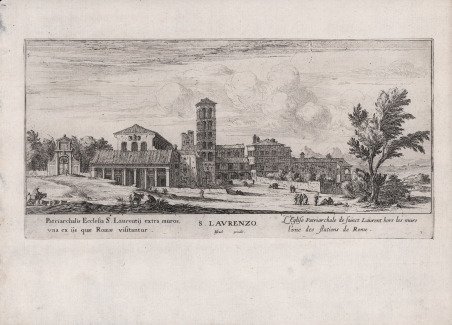 Veduta della chiesa di S. Maria del Popolo con facciata e cupola del primo Rinascimento. ' Nella piazza di fronte scene di vita quotidiana con animali e persone. In basso iscrizioni latine e francesi. Veduta tratta dalla serie ' Les stations de Rome. ' Il Silvestre, incisore e disegnatore, nasce a Nancy nel 1621. Come era consuetudine all'epoca, fece diversi viaggi in Italia per copiare i vecchi maestri e per migliorare le sue abilità con i più grandi maestri. Faucheux fissa le date di questi viaggi, il primo prima del 1640 (Israel non aveva ancora 20 anni), il secondo dal 1643 al 1644 e l'ultimo intorno al 1653. Israel portò con sé molte vedute dell'Italia, quasi tutte incise. Fino al 1659, fece altri viaggi in Francia e in Lorena, da cui trasse molti disegni e incisioni. Il suo stile fu, all'inizio, piuttosto sciolto, ma dal 1643 in poi divenne più raffinato e delicato, acquisendo accuratezza e precisione senza essere asciutto, risultando a volte simile a quello di Jacques Callot o di Stefano della Bella, con i quali ebbe rapporti di amicizia attraverso il suo zio materno e mentore, l’editore Israël Henriet. Accanto alle testimonianze per la Roma antica mostrò ben presto un grandissimo interesse per la città "moderna", divenendo uno dei precursori del vedutismo - non solo nel campo incisorio - anticipando artisti come Lievin Cruyl e Gaspar van Wittel. È praticamente impossibile fare un inventario completo delle opere di Israël Silvestre, tanto era prolifico l'artista. Ha lasciato numerosi disegni e più di mille incisioni. Tra le sue opere più belle, possiamo tuttavia menzionare le numerose e complesse “piccole” suite (composte da poche tavole) sulle piazze, le chiese e le antichità di Roma. Acquaforte, in ottimo stato di conservazione. Bibliografia L. E. Faucheux, ' Catalogue raisonné de toutes les estampes qui forment l'oeuvre d'Israel Silvestre: précédé d'une notice sur sa vie ' (1857), n. 2.7; F. Baré, ' Israël Silvestre et sa famille, suivi du catalogue de son oeuvre ' (1885), n. 813. View taken from the series ' Les stations de Rome. ' Les stations de Rome, suite of 10 numbered pieces, not including the title. The inscriptions of this suite are in French (italic characters) and in Latin (Roman characters). The title of each piece which separates the Latin inscription from the French inscription is in Italian and in large characters. Silvestre, engraver and draftsman, was born in Nancy in 1621. As was customary at the time, he made several trips to Italy to copy the old masters and to improve his skills with the greatest masters. Faucheux fixes the dates of these trips, the first before 1640 (Israel was not yet 20 years old), the second from 1643 to 1644 and the last around 1653. Israel brought with him many views of Italy, almost all of them engraved. Until 1659, he made other trips to France and Lorraine, from which he took many drawings and engravings. His style was, at the beginning, rather loose, but from 1643 onwards became more refined and delicate, acquiring accuracy and precision without being dry, resulting sometimes similar to that of Jacques Callot or Stefano della Bella, with whom he had friendly relations through his maternal uncle and mentor, the publisher Israël Henriet. Alongside the testimonies to ancient Rome, he soon showed great interest in the "modern" city, becoming one of the precursors of vedutism - not only in the field of engraving - anticipating artists such as Lievin Cruyl and Gaspar van Wittel. It is quite impossible here to make a complete inventory of Israël Silvestre's works, so prolific was the artist. He left numerous drawings and more than a thousand engravings. However, among his most beautiful works, we can mention the many complex "small" suites (composed of a few plates) on the squares, churches and antiquities of Rome. Etching, in excellent condition. Bibliografia L. E. Faucheux, Catalogue raisonné de toutes les estampes qui forment l'oeuvre d'Israel Silvestre: précédé d'une notice sur sa vie (1857), n. 2.7; F. Baré, Israël Silvestre et sa famille, suivi du catalogue de son oeuvre (1885), n. 813. Cfr.