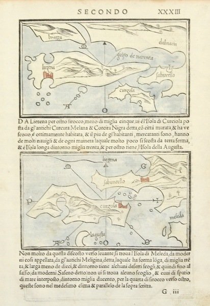 Silografia, mm 83x146 (su foglio 290x200), colorata. Tratta da "Isolario nel qual si ragiona di tutte le isole del mondo" pubblicato dal 1528 al 1562. Una delle prime raffigurazioni delle Tremiti accompagnata al verso da due silografie mm 80x145 di Lesina e Curzola. Ottimo esemplare. <BR><BR>