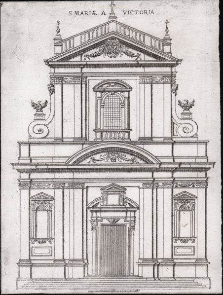 Facciata della ' Chiesa di Santa Maria della Vittoria. Acquaforte, stampata su carta vergata coeva, buone condizioni. Poco si sa di Regnard, se non che fu un incisore francese che trascorse gran parte della sua vita lavorativa a Roma realizzando belle incisioni dei magnifici edifici e delle antichità. Quest'opera di Regnard fu pubblicata a Roma da Francois Collignon nel 1650, senza titolo, ma in un insieme noto come ' Praecipua urbis templa. Le tavole mostrano prospetti, sezioni e piante di chiese romane del XVI e XVII secolo, con didascalie che le identificano e i loro architetti (con occasionali attribuzioni errate). Includono lavori di Carlo Maderno, G. della Porta, F. da Volterra, la famiglia Longhi, G.B. Soria e molti altri. Rara. Chiesa di Santa Maria della Vittoria. ' Etching, printed on contemporary laid paper, good condition. Little is known about Regnard, except that he was a French engraver who spent much of his working life in Rome making fine engravings of the magnificent buildings and antiquities. This work by Regnard was published in Rome by Francois Collignon in 1650, without a title, but in a set known as ' Praecipua urbis templa. The plates show elevations, sections and plans of 16th- and 17th-century Roman churches, with captions identifying them and their architects (with occasional misattributions). They include work by Carlo Maderno, G. della Porta, F. da Volterra, the Longhi family, G.B. Soria and many others. Rare. Cfr.