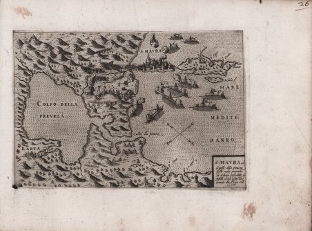 In alto al centro ISOLA DI S. MAURA a sinistra in una targa ovale SANCTA MAURA Scopulus anticham.e detta Isola posta sul Adriatico Mare dirimpetto al Golfo di Larta Questa isola è da un canale da terra divisa, et abondante di acque et legni. In basso a sinistra una rosa dei venti con l’ovest in alto, nell’angolo a destra il numero 35. Carta priva di scala grafica e graduazione ai margini. Carta anonima di Lefkada, nota in passato col nome di Santa Maura, priva di data ed indicazioni editoriali ma edita da Camocio. La carta deriva dal modello gastaldino del 1560. Tuttavia è una carta che, date anche le dimensioni, presenta diverse inesattezze. La mappa, come era usuale per Camocio e altri editori suoi contemporanei, circolava come carta sciolta prima di essere poi inserita nella raccolta Isole famose, porti, fortezze e terre marittime sottoposte alla Serenissima Signoria di Venetia, ed altri Principi Christiani, et al Signor Turco, nouamente poste in luce. In Venetia alla libreria del segno di San Marco. Esistono pertanto delle prove prive di numerazione, che si trovano in alcune raccolte cinquecentesche. Esistono altresì delle prove avanti il numero che si trovano negli isolari camociani. Alla morte dell’editore (1575) le lastre furono acquisite da Donato Bertelli, che le ristampò aggiungendo una numerazione sequenziale. A rival Island-book to the Isole Famose by Camocio was published by Simone Pinargenti, Venice 1573, under the title “Isole che son da Venetia nella Dalmatia et per tutto l’arcipelago fino a Costantinopoli”. The Pinargenti’s are variously arranged in each one of them, without consecutive engraved numbering, as the early editions of Camocio’s work. A large number of the plates are signed by Pinargenti himself, one dated 1570, and onother one 1571. Like the larger maps of The IATO these smaller ones were first issued for a loose sheet circulation, and then assembled in booklet form for interested customer. Showing Lefkada. Very rare. Watermark: “siren in a shield with star” (Beans 36, Heawood 21 dated 1562-66). Cfr. Zacharakis C. G. "A Catalogue of Printed Maps of Greece 1477 - 1800 (2009), n. 2693