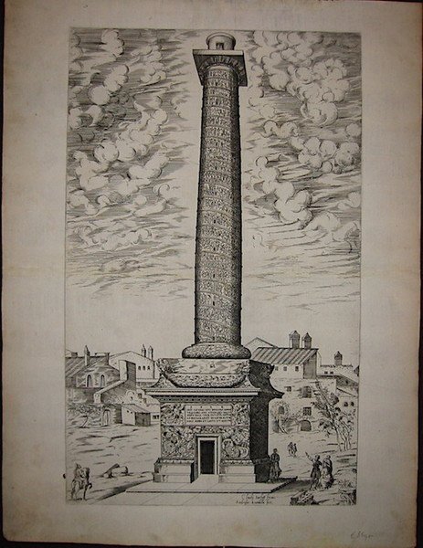 Incisione originale su rame (cm. 30x48,5 più ampi margini bianchi). Carta vergellata con filigrana. Esemplare in ottimo stato di conservazione. Imprint in basso al centro: ‘Claudij duchetti formis’. Replica, pubblicata da Claude Duchet (Duchetti), dell’edizione lafreriana del 1544. Arrigoni-Bertarelli, n. 1548. Rubach, n. 287. Affascinante veduta della Colonna Traiana con sfondo di case su una linea assai bassa e figure umane. La colonna, inaugurata nel 113 d.C., fu edificata per celebrare la conquista della Dacia da parte dell’Imperatore Traiano. Antoine Lafrery (Antonio Lafreri nella forma italianizzata), incisore, editore e mercante di stampe curò la pubblicazione tra il 1544 ed il 1575 di una serie di circa 200 incisioni - raffiguranti perlopiù monumenti ed antichità romane ed opera di diversi autori - nota come ‘Speculum Romanae Magnificentiae’. Le stampe erano poste in vendita sia singolarmente che sotto forma di raccolta con un numero spesso variabile di fogli. Dal 1574 iniziò a circolare anche una tavola-frontespizio dello ‘Speculum’, attribuita a Etienne Duperac. Successivamente, tra il tardo Cinquecento ed il Settecento, i rami lafreriani conobbero tirature posteriori con l’imprint di vari editori ed il contributo di diversi incisori. Inoltre lo ‘Speculum’ fu ampliato nel tempo mediante l’aggiunta di altre tavole il cui minimo comune denominatore appare quello di riprodurre opere antiche e moderne di Roma.