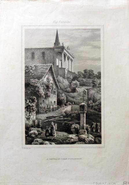 Trieste, 1860 circa. Incisione su acciaio, b/n, cm 14,3 x 20,3 (la parte figurata) più margini. Scorcio animato con veduta della chiesa di San Pietro nella Valle di Incarogio. Ottima conservazione.