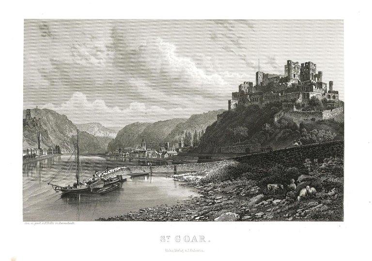 Incisione, antica ed originale. raffigurante il panorama della cittadina lungo il fiume Reno