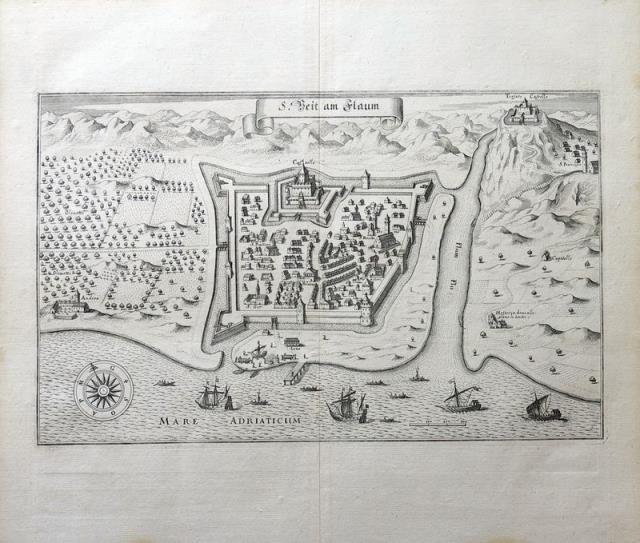 Tratta dalla "Topographia Provinciarum Austriacarum, Styriae, Carinthiae, Carniolae, Tyrolis etc.”, Francoforte, 1679 circa. Incisione in rame all’acquaforte, b/n, cm 21,2 x 33,2 ca. (alla lastra) più margini. Pianta prospettica della città di Fiume, con vascelli in mare e rosa dei venti in basso a sinistra. Agli inizi del secondo millennio, Fiume la si trova con il nome latino di “Flumen” (tradotto dai croati in Reka, Rika o Rijeka) e nel Medioevo fu anche conosciuta come “Terra Sancti Viti”, dal momento che l'uso della lingua latina appare costantemente nei documenti della pubblica amministrazione, così come, nelle epoche successive, l’uso della lingua italiana. Esemplare a pieni margini e in ottimo stato di conservazione.