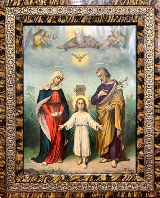 Sacra Famiglia con Dio Padre e Angeli nel cielo.