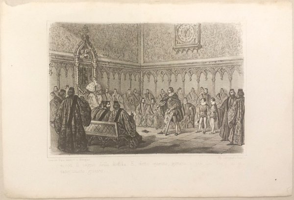 Litografia di mm 120 x 190 (sola illustrazione) in perfetto stato di conservazione. L'immagine, di squisita fattura, proviene dal volume di Fabio Mutinelli :"Gli Annali urbani di Venezia. Il secolo decimosesto".