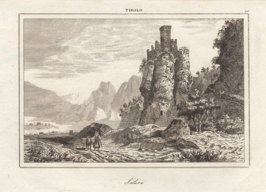Litografia di dimensioni 90x132 mm. Condizioni : USATO - Stato : Buono, ordinari segni d'uso e del tempo. Altre note : Veduta paesaggistica raffigurante la Haderburg, il castello di Salorno, visibile sulla destra su un appuntito sperone di roccia. Nel primo piano una figura femminile in costume tipico avanza verso l'osservatore accompagnata da un mulo, mentre lo sfondo, reso con tratto meno deciso, è attraversato dal fiume Adige.