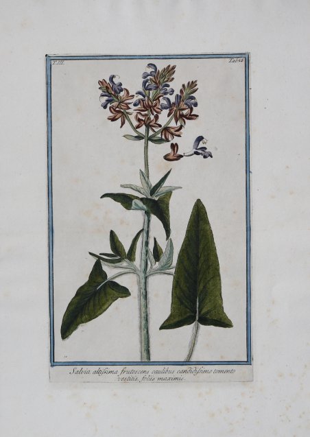 Tavola botanica tratta dal monumentale Hortus Romanus Juxta Systema Tournefortianum Paulo Strictius Distributus A Georgio Bonelli Monregalensi In Subalpinis, Publico Medicinae Professore: Specierum Nomina Suppeditante, Praestantiorum, Quas Ipse Selegit, Adumbrationem Dirigente Liberato Sabbati Maevaniensi In Umbria Chirurgicae Professore, Et Horti Custode; Adjectis Unicuique Volumini Rariorum Plantarum Tabulis C. Aere Incisis. Tom. I. (- Tom. VII.) L’opera viene stampata a Roma durante l’arco di ben 22 anni e da diversi editori: a spese di Bouchard e Gravier: Paolo Giunchi, 1772-1780-Tipografia Salomoni, 1784-Giovanni Zempel, 1793. Prima edizione di questa monumentale opera di botanica, sicuramente la più vasta e riccamente illustrata tra quelle prodotte in Italia fino ad allora. Intorno al 1770 gli editori francesi Bouchard e Gravier, avendo intenzione di dare alle stampe un catalogo illustrato dell’Orto botanico di Roma, ne proposero la direzione al medico piemontese Giorgio Bonelli (1724-1782), allora docente presso l’università romana. La cura della preparazione dei campioni per l’apparato iconografico fu invece affidata a Liberato Sabbati (1714-1778), un farmacista umbro, che era allora custode dell’Orto medesimo. Il primo volume uscì nel 1772 con una ricca introduzione del Bonelli, in cui questi fornisce un resoconto dei più recenti sviluppi della botanica e dei nuovi sistemi di classificazione e adduce poi i motivi della sua preferenza per il sistema elaborato da Joseph Pitton de Tournefort, a suo avviso più semplice e adatto all’apprendimento. Per ragioni ignote Bonelli abbandonò tuttavia l’impresa. Nel 1774, a partire dal secondo volume, essa fu presa in mano e poi condotta a termine da Niccolò Martelli (1735-1829), docente di botanica della Sapienza. Questi dette all’opera un’impostazione più linneana, pur continuando ad avvalersi della collaborazione di Liberato Sabbati fino alla sua morte, che avvenne nel 1778 al termine della pubblicazione dei primi cinque volumi. Il suo posto fu quindi preso dal figlio Costantino Sabbati. L’Hortus romanus contiene la classificazione delle varie specie di piante ospitate nell’Orto Botanico di Roma, che, stando a quanto affermato nella Horti Romani brevis historia che apre il primo volume, fu fondato a metà del Quattrocento sotto il pontificato di Niccolò V. In realtà i primi orti botanici italiani furono quelli creati a Padova e a Pisa intorno al 1545. L’Orto Romano sorse poco tempo dopo e, ampliatosi più volte, nel 1660 fu trasferito dalla sede vaticana al Gianicolo, dove ancora oggi si trova. La maggior parte delle tavole numerate non sono firmate, ma alcune sono firmate come incise da Magdalena Bouchard Il primo volume è dedicato dagli editori, Joannes Bouchard et Joannes Josephus Gravier, al Papa Clemente XIV; il secondo, al Cardinale Bernis; il terzo, al Cardinale Zelada; il quarto, al Cardinale Giraud. Il sesto volume è dedicato - dall'autore, Nicolaus Martelli - al cardinale Boncompagni. Acquaforte, finemente colorata a mano in epoca, in perfetto stato di conservazione. Bibliografia K. Nissen, ' Die botanische Buchillustration, 2 v. & suppl. (1951-1966); Great Flower Books p. 51. Hunt 629. Cleveland Botanical 509. Dunthorne 45. Pritzel 976. Nissen, BBI 200. Stafleu & Cowan TL2 634. Botanical plate from the Hortus Romanus Juxta Systema Tournefortianum Paulo Strictius Distributus A Georgio Bonelli Monregalensi In Subalpinis, Publico Medicinae Professore: Specierum Nomina Suppeditante, Praestantiorum, Quas Ipse Selegit, Adumbrationem Dirigente Liberato Sabbati Maevaniensi In Umbria Chirurgicae Professore, Et Horti Custode; Adjectis Unicuique Volumini Rariorum Plantarum Tabulis C. Aere Incisis. Tom. I. (- Tom. VII.) The work was printed in Rome over a period of 22 years and by different publishers: at the expense of Bouchard and Gravier: Paolo Giunchi, 1772-1780-Tipografia Salomoni, 1784-Giovanni Zempel, 1793. First edition of this monumental work of botany, certainly the most extensive and richly illustrated among those produced in Italy until then. Around 1770, the French editors Bouchard and Gravier, having the intention of printing an illustrated catalog of the Botanical Garden of Rome, proposed the direction to the Piedmontese doctor Giorgio Bonelli (1724-1782), then a professor at the University of Rome. The care of the preparation of samples for the iconographic apparatus was instead entrusted to Liberato Sabbati (1714-1778), an Umbrian pharmacist, who was then custodian of the Garden itself. The first volume was published in 1772 with a rich introduction by Bonelli, in which he gives an account of the most recent developments in botany and new systems of classification and then gives the reasons for his preference for the system developed by Joseph Pitton de Tournefort, in his opinion simpler and more suitable for learning. For unknown reasons Bonelli abandoned the enterprise. In 1774, starting with the second volume, it was taken over and then completed by Niccolò Martelli (1735-1829), professor of botany at the Sapienza. Martelli gave the work a more Linnean approach, while continuing to use the collaboration of Liberato Sabbati until his death in 1778 at the end of the publication of the first five volumes. His place was taken by his son Costantino Sabbati. The Hortus romanus contains the classification of the various species of plants housed in the Botanical Garden of Rome, which, according to what is stated in the Horti Romani brevis historia that opens the first volume, was founded in the mid-fifteenth century under the pontificate of Nicholas V. In reality, the first Italian botanical gardens were created in Padua and Pisa around 1545. The Roman Garden arose shortly thereafter and, expanded several times, in 1660 was transferred from the Vatican to the Janiculum, where it is still located today. Most of the numbered plates are unsigned, but a few are signed as engraved by Magdalena B