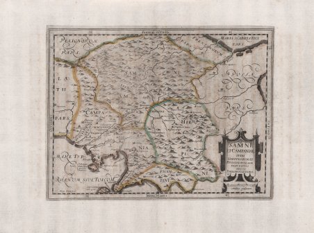 Rara edizione francese, incisa da Henri le Roy. Carta storico geografica tratta da ' Italia Antiqua ' di Philipp Cluver (1580-1623) - noto anche con il nome latinizzato in Cluverius e quello di Cluverio in italiano - geografo tedesco e fondatore della geografia storica. Tra il 1607 e il 1610 viaggiò attraverso varie regioni europee, toccando l’Inghilterra, la Germania, la Francia e l’Italia, dove fece un ulteriore viaggio tra il 1616 ed il 1618. La celebre opera conobbe una prima edizione nel 1624 a Leida, con le mappe incise da Nicolas van Geelkercken (1585-1656). Dell’opera del Cluver sono note numerose ristampe sia a Leida che in altre città europee; tutte comprendono mappe basate sulle originali del Geelkercken, ma incise da altri artisti. Le carte furono ristampate, in forma ridotta, in primis da Hendrick Hondius. ' ' La più rara ristampa viene pubblicata a Parigi nel 1659 con le lastre rifatte dall'incisore francese Henri le Roy come si legge nell'angolo di sinistra della nostra mappa. Henri Le Roy (1579-1652) fu un incisore ed editore nato a Rotterdam e sposato a Parigi nel 1604. Ha prodotto una serie di disegni ispirati al mondo naturale, incorporando uccelli, insetti e piante nel suo lavoro. È il caso di questa serie di sette disegni di fregio, che potrebbero essere stati utilizzati come disegni per ornamenti architettonici, tessuti o altri oggetti. Nel settore cartografico sono note alcune mappe, tra le quali una carta del mondo, di derivazione da Hendrick Hondius. Acquaforte, con coloritura coeva dei contorni, in ottimo stato di conservazione. Le carte dell'Italia dell'erudito tedesco Philippo Cluverius furono per la prima volta pubblicate nel 1624 nel celebre "Italia Antiqua". Successivamente alla morte dell'autore le carte furono ristampate, in forma ridotta, da Hondius e a Parigi da Bunon nel 1659, incise da Henry le Roy. L'edizione parigina risulta più rara dell'originale.Acquaforte, finemente colorata a mano nei contorni, in ottimo sttao di conservazione. Cfr.