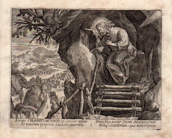 SAN CARITONE EREMITA - THOMAS de LEU [Leeuw or Le Leup or Deleu] (1560-1612) ". CHARITON vinciis & carcere missus" Si narra che, tornando da un pellegrinaggio a Gerusalemme Caritone fosse stato assalito da una banda di briganti che lo imprigionarono e lo portarono nel loro covo. Mentre si trovava lì immobilizzato, il santo vide un serpente attorcigliarsi sopra un recipiente e bere il vino che lì era contenuto. I briganti assumendo la bevanda morirono avvelenati, permettendo così al santo di riacquistare la libertà