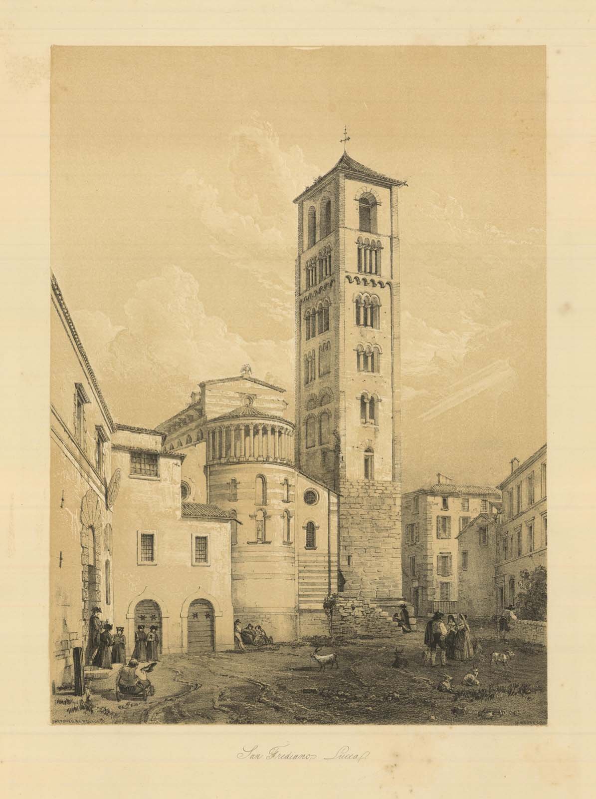 Bella veduta della chiesa di San Frediano animata da personaggi, stampata su fondo seppia