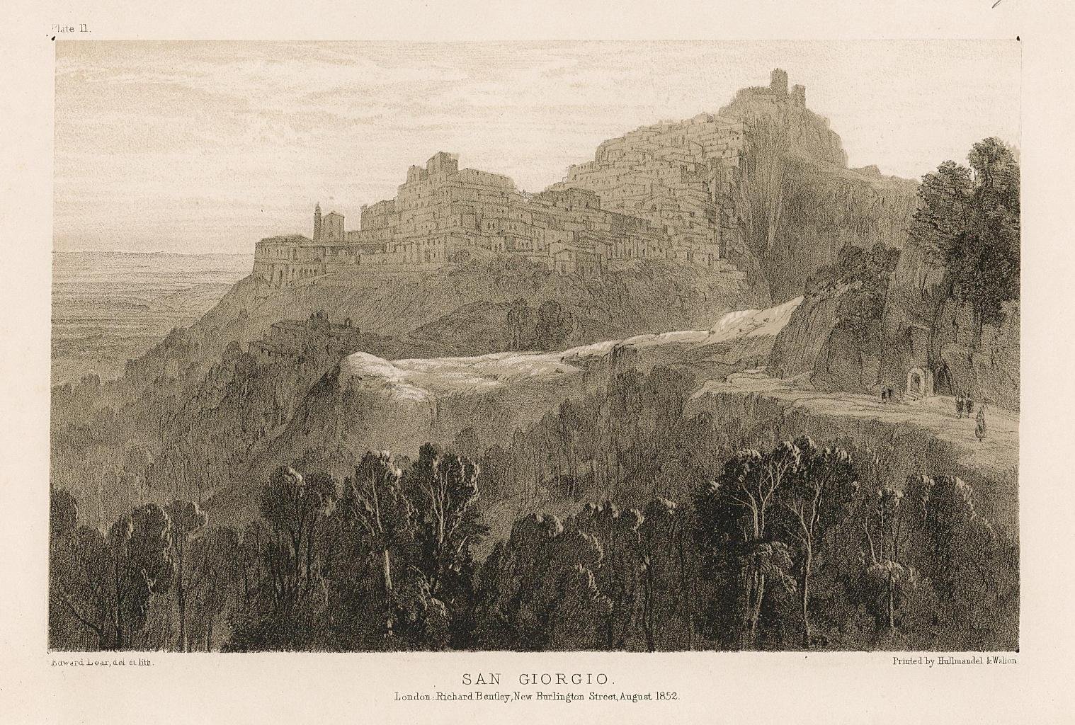 Stampa, antica ed originale, con veduta panoramica della cittadina. Autore: Lear Edward dis. & lith. Luogo: San Giorgio Morgeto - (RC). Anno: 1852. Tecnica: litografia su fondo seppia. Dimensioni: 122x195. tratta dall'opera "Journals of a landscape painter in southern Calabria" by Edward Lear. Pubblicata a Londra da Richard Bentley in New Burlington Street